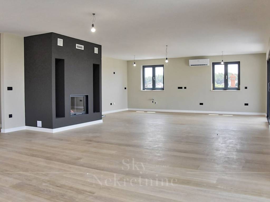 Stan se nalazi na 2. katu zgrade izgrađene 2023. godine. Stan se sastoji od ulaznog hodnika, open-space dnevnog boravka, kuhinje i blagovaonice, pet spavaćih soba od kojih svaka ima svoju kupaonicu, natkrivene terase, krovne terase, garaže te spremišta.