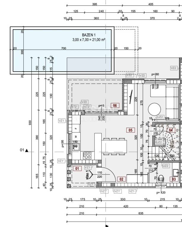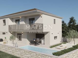Kuća se prostire na dvije etaže i sastoji se od ukupno tri spavaće sobe, dvije kupaonice i dodatnog toaleta, kao i prostranog dnevnog boravka. U uređenoj okućnici nalazi se bazen s elektrolizom i dizalicom topline, a cijeli prostor odiše mediteranskim ugođajem – zahvaljujući kamenim ogradnim zidovima, kamenim detaljima na fasadi i pažljivo osmišljenoj hortikulturi s autohtonim biljem, futinijama i stoljetnim maslinama starim čak 300 godina. Nekretnina je opremljena vrhunskim sustavom podnog grijanja na vodu s dizalicom topline renomirane marke Vaillant, dok je za hlađenje ugrađena inverter klimatizacija Toshiba. Korištena je kvalitetna PVC stolarija s troslojnim staklima, a rolete su na električno upravljanje. Također je predviđena priprema za video nadzor i alarmni sustav, što dodatno doprinosi osjećaju sigurnosti i udobnosti.