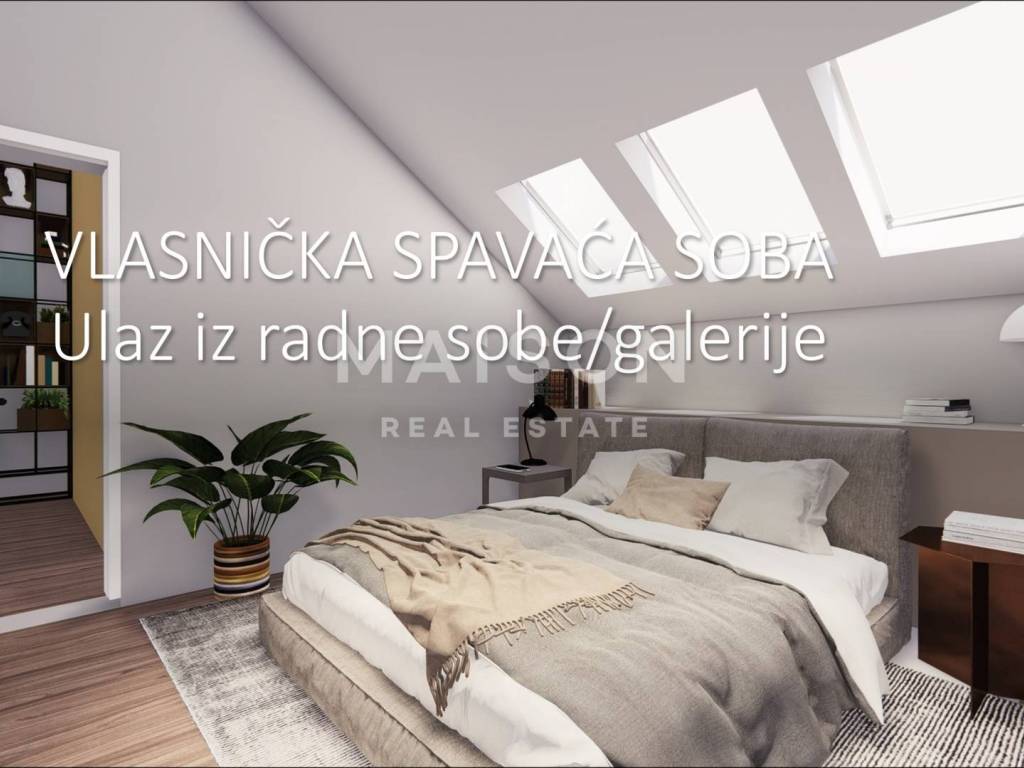 Etaža 2; master spavaća soba, manja spavaća soba i kupaona, radna soba.