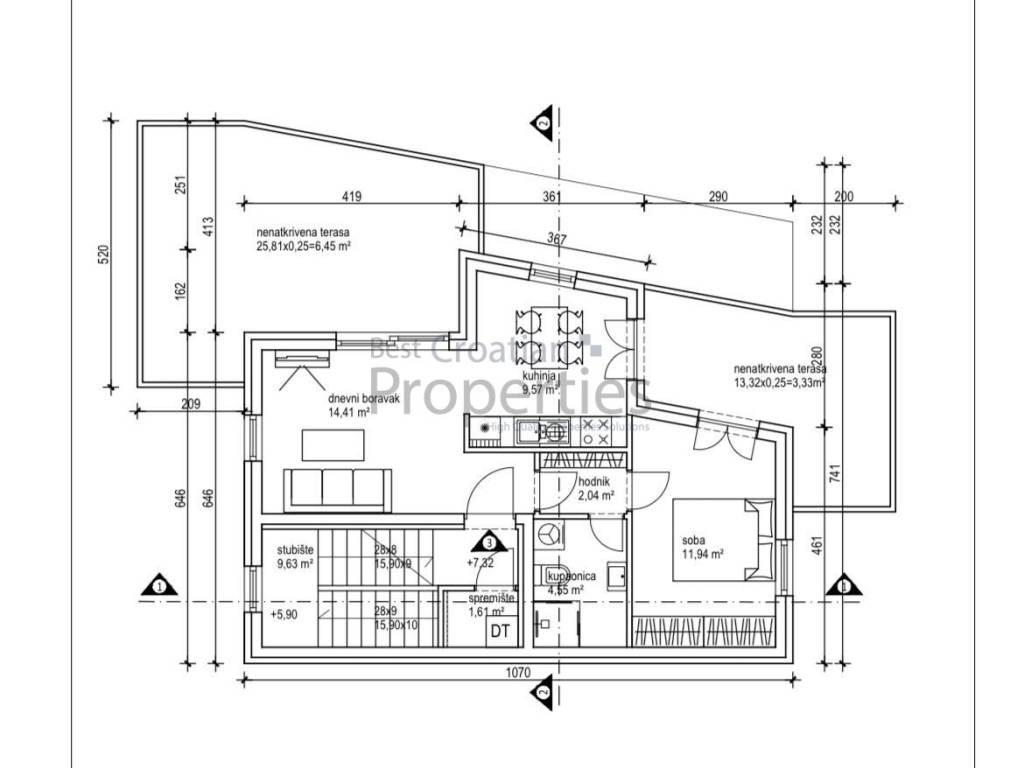 Sami stan ima 54m2 sa dvije prekrasne terase od 25.81m2 i 13.32m2. Uz stan ide i vanjsko parkirno mjesto od 12.50m2 uključeno u cijenu.