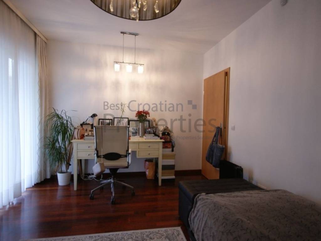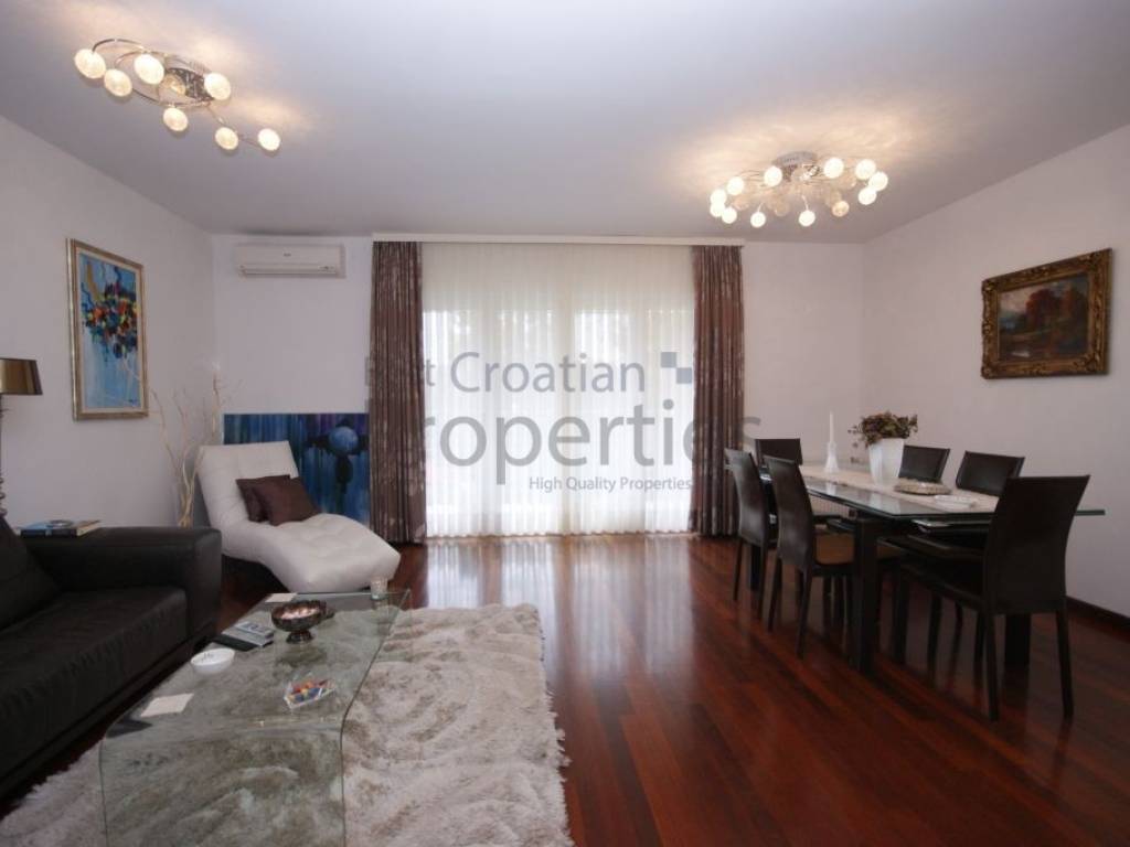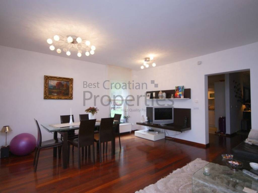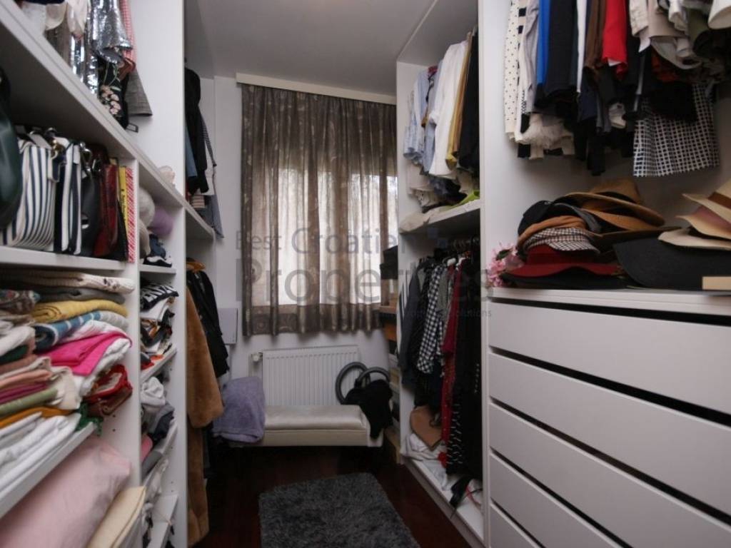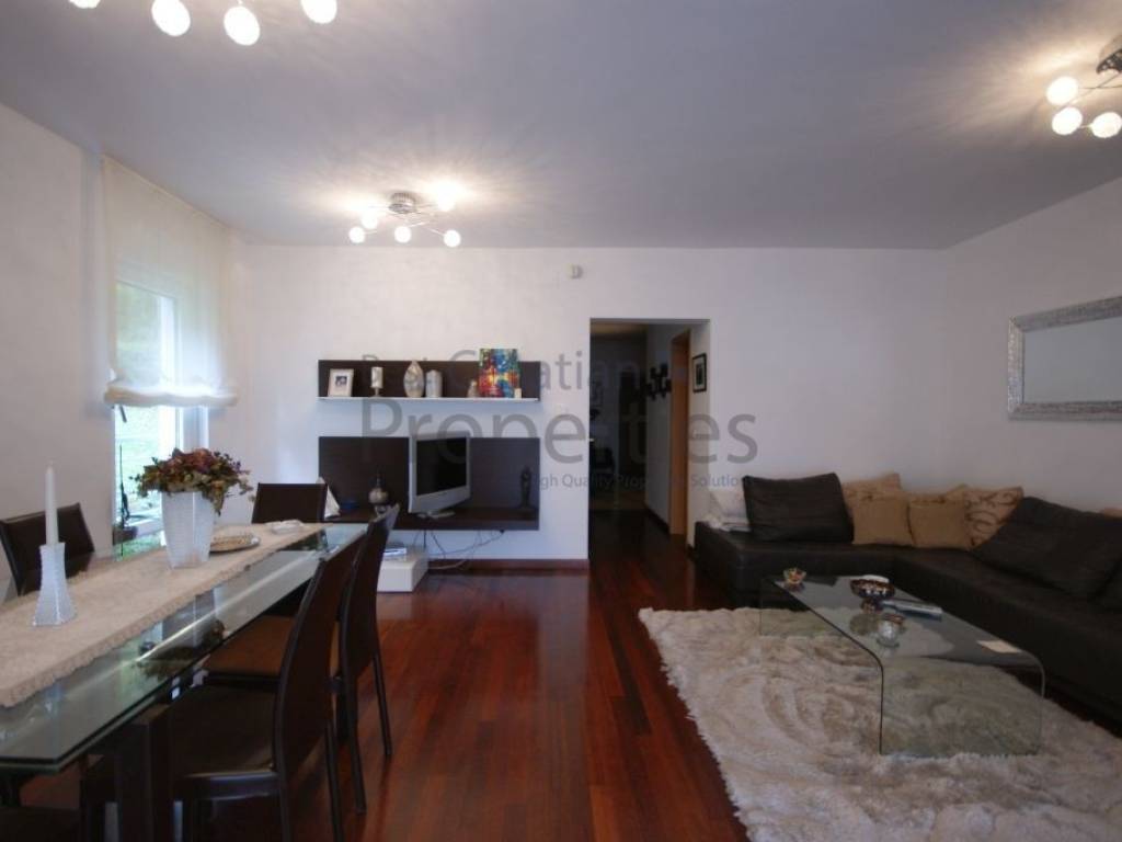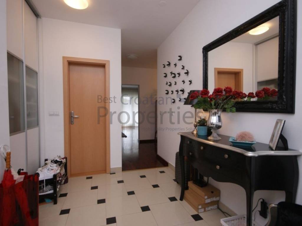 Stan se sastoji od prostranog dnevnog boravka s izlazom na natkriveni balkon, kuhinje, predsoblja, spavaće sobe s izlazom na terasu s koje se izlazi na vrt koji je u vlasništvu stana (cca 45 m2), dvije dječje sobe, prostrane kupaonice, zasebnog WC-a. Stanu pripadaju i dva parkirna mjesta u dvorištu zgrade.