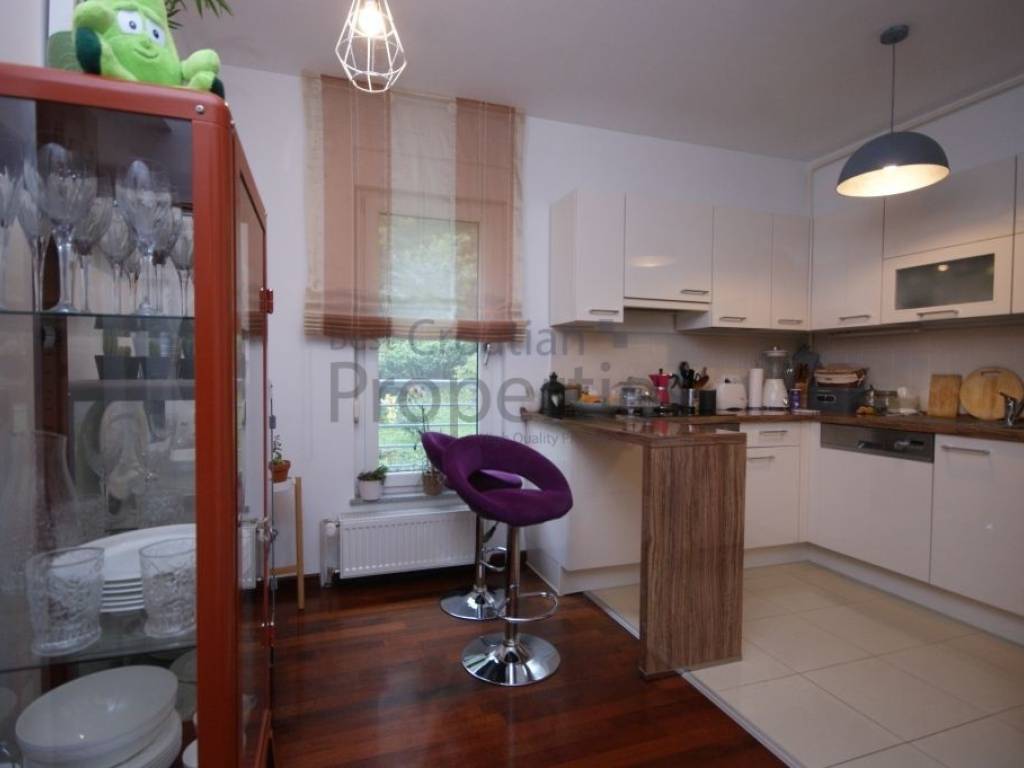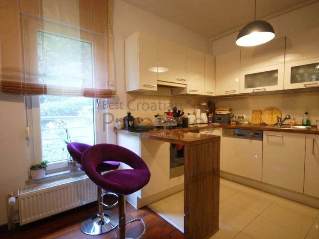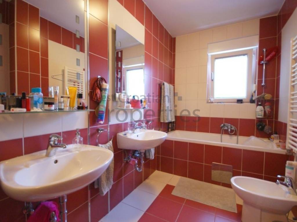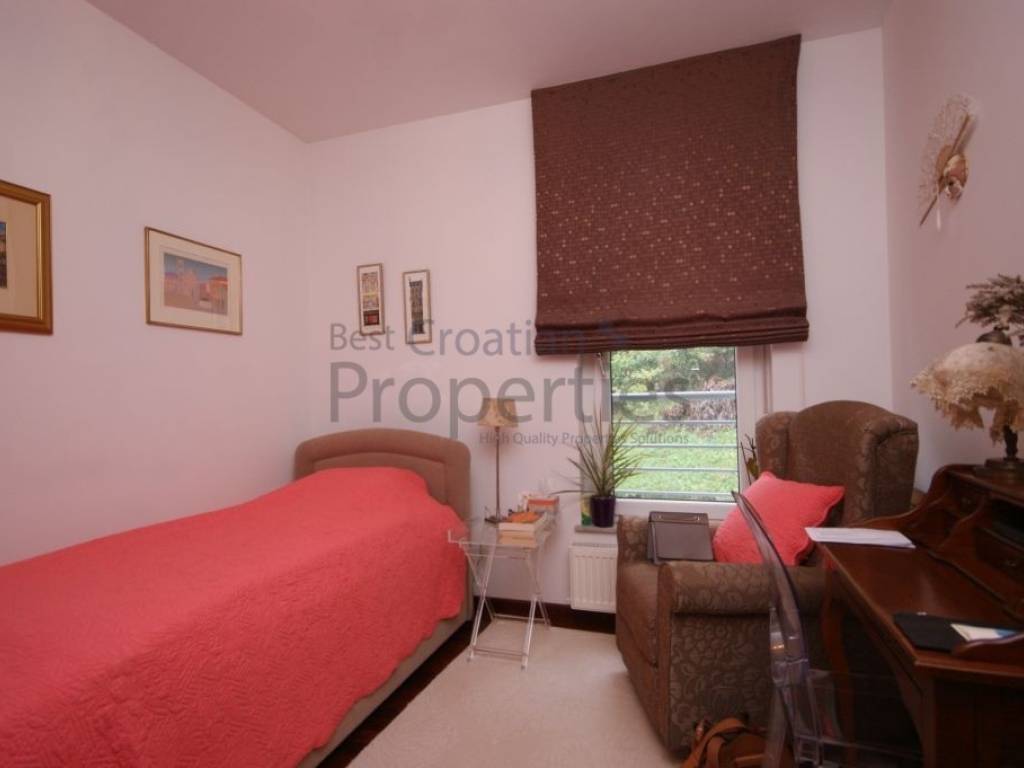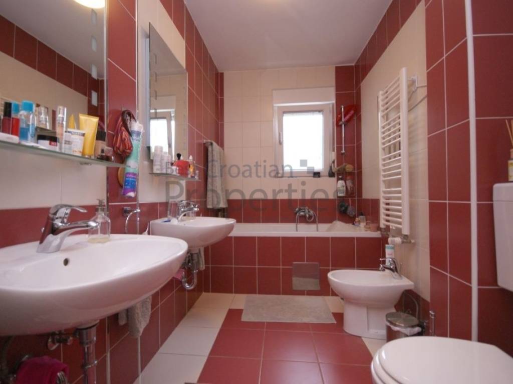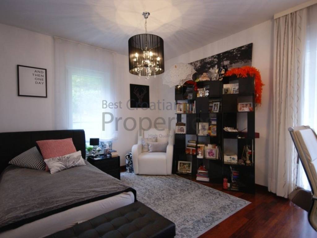 Stan se sastoji od prostranog dnevnog boravka s izlazom na natkriveni balkon, kuhinje, predsoblja, spavaće sobe s izlazom na terasu s koje se izlazi na vrt koji je u vlasništvu stana (cca 45 m2), dvije dječje sobe, prostrane kupaonice, zasebnog WC-a. Stanu pripadaju i dva parkirna mjesta u dvorištu zgrade.
