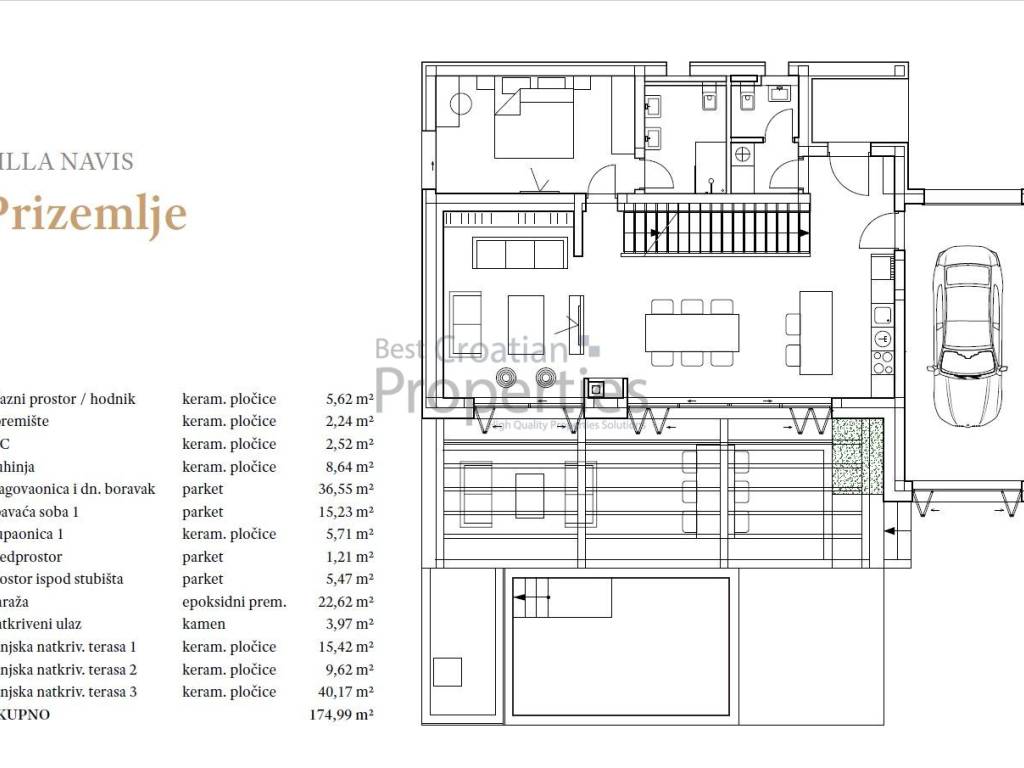 Prizemlje (175 m): hodnik, WC, dvije ostave, prostrana kuhinja s blagovaonicom i dnevnim boravkom, spavaća soba s vlastitom kupaonicom, garaža te čak tri prostrane terase za maksimalan užitak na otvorenom
