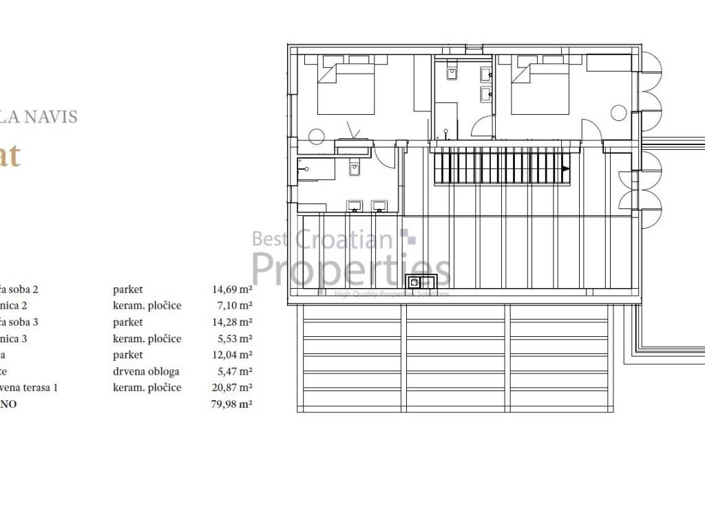 Kat (80 m): dvije udobne spavaće sobe, kupaonica, galerija i natkrivena terasa koja nudi dodatnu privatnost i pogled