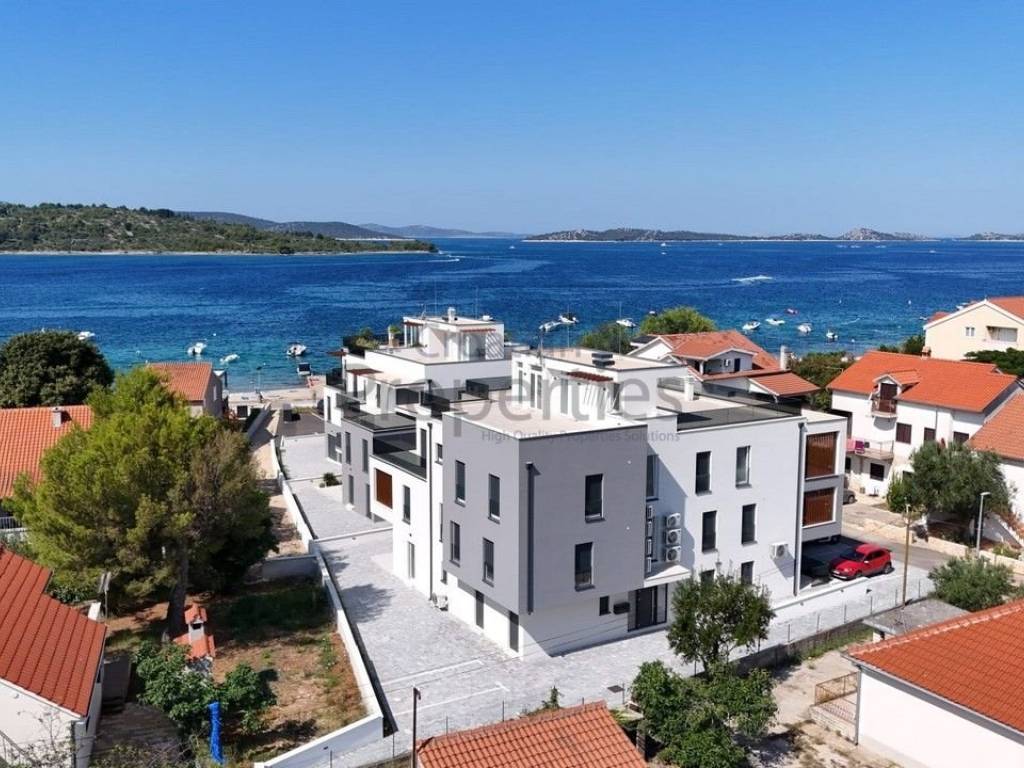 Ova moderna novogradnja, sa ukupno osam stambenih jedinica i dva poslovna prostora, smještena je u prvi red uz more, na prekrasnoj, šljunčanoj plaži.