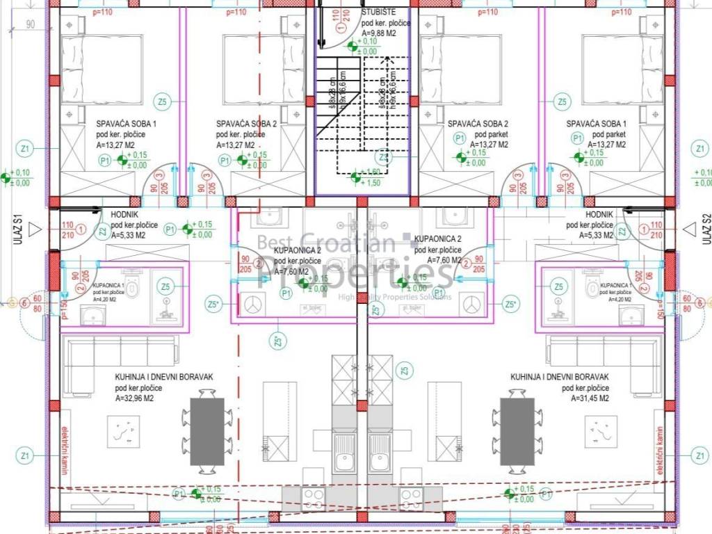 Stan sesastoji od hodnika (5.33m2) , prostranog dnevnog boravka s kuhinjom i blagovaonicom (32.96m2) , dvije spavaće sobe (obje 13.27m2), dvije kupaonice (7.6m2 i 4.2m2) i terase od 17m2.