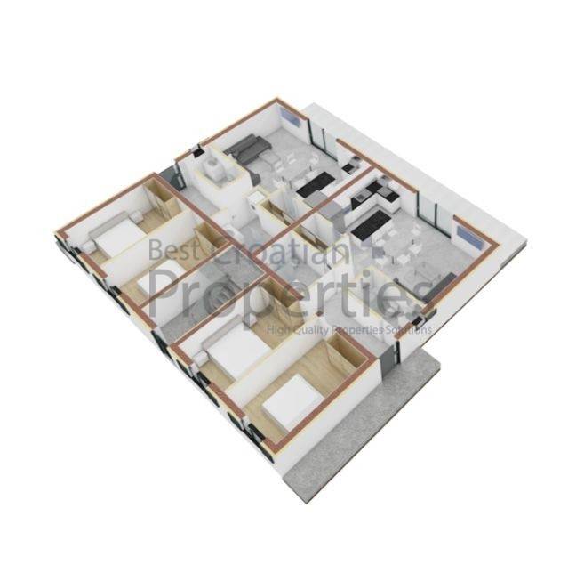 Prodaje se odličantrosoban stan (stan 85m2 + terasa 17m2+ podrum 15m2+ okučnica 70m2) na području Šibenika u Crnicama.
