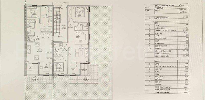 Stan u prizemlju ima 73,44m2 neto korisne stambene površine te sadrži: ulazni prostor, dnevnu sobu s blagovaonicom i kuhinjom, dvije spavaće sobe, dvije kupaonice te dvije terase, od kojih je jedna natkrivena.