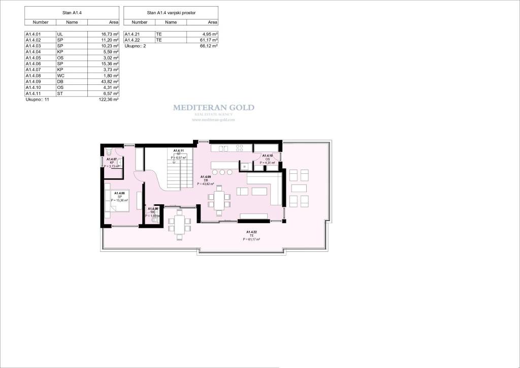 A1.4 150m2, dvoetažan, prvi i drugi kat, trosoban stan, + 2 parkirna mjesta = 510.000€.
