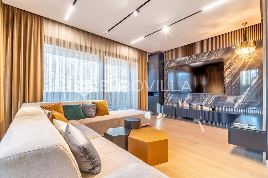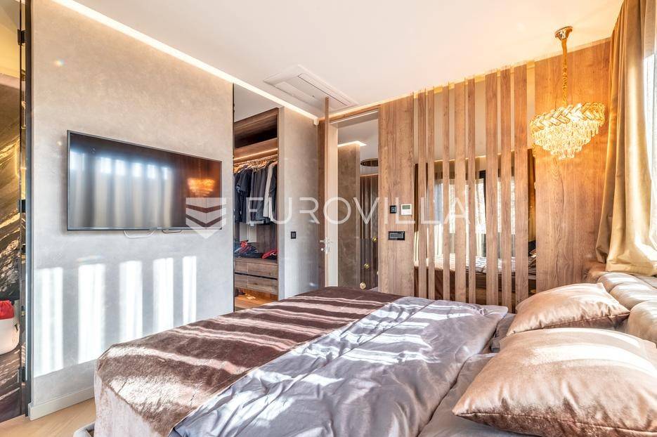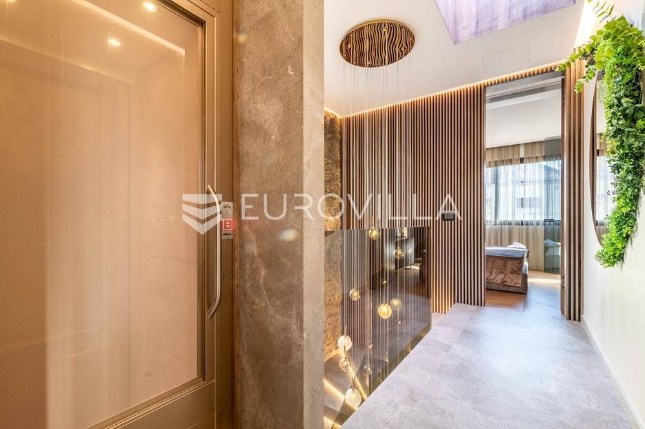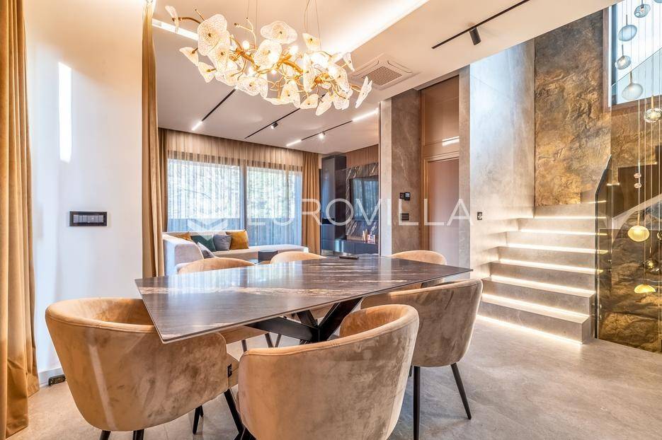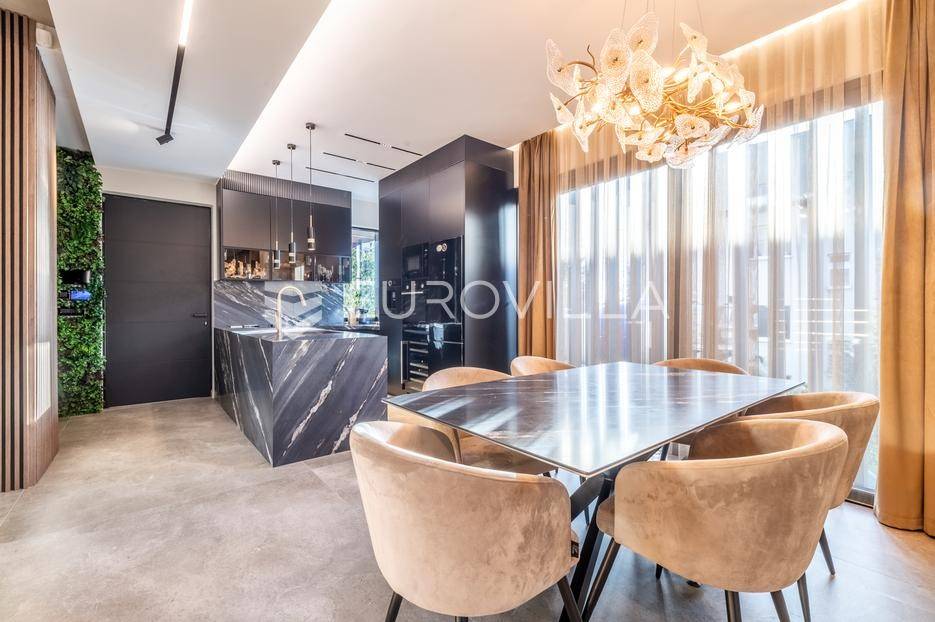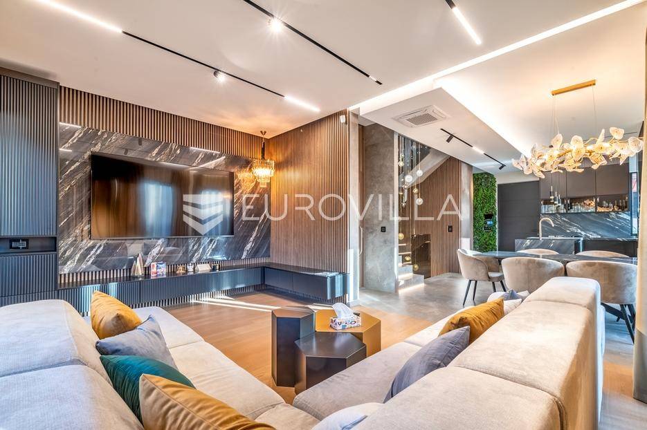Srebrnjak, NOVOGRADNJA, ekskluzivna luksuzna villa projektirana prema najvišim građevinskim standardima zatvorene površine 185,00 m2 na jednoj od najljepših mikrolokacija u centru grada.Izgrađena na 3 etaže koje su međusobno povezane unutarnjim stubištem i liftom. Podrum: prostor za druženje s izlazom na prostranu terasu s jacuzzijem, kupaonica, sauna i gospodarstvo. Prizemlje: dnevni boravak, kuhinja i blagovaonica otvorenog tlocrta, garderoba. Prvi kat: hodnik, dvije spavaće sobe s kupaonicama, master soba s kupaonicom i garderobom, loggia 9,10 m2. Pripada joj dvorište s natkrivenim parkingom za dva vozila. Ukupno obračunski NKP 245,90 m2.Prodaje se potpuno namještena i opremljena. Visoko kvalitetna oprema: aluminij stolarija (troslojno izo staklo), protuprovalna ulazna vrata, vrhunska keramika i sanitarna oprema, podno grijanje kroz cijeli prostor ville, električne rolete, dizalica topline, rekuperatori zraka, sve skrivene stropne jedinice, smart rasvjeta, alarm, kamere…Vrlo dobro prometno povezano autobusnim i tramvajskim linijama koja je u blizini sa svim dijelovima grada. U blizini lokacije je gradski vrtić i osnovna škola, tržnica Kvatrić, dom zdravlja, pošta, ljekarne, trgovine i sve potrebno za kvalitetan obiteljski život.Sve ostale informacije na upit.