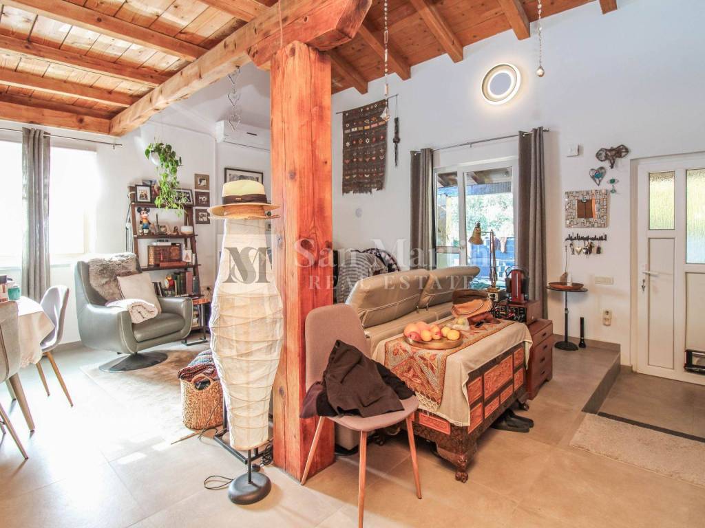 Prostran dnevni boravak i blagovaonica (43 m) s visokim stropovima, drvenim gredama i kaminom na drva savršeno mjesto za obiteljska druženja