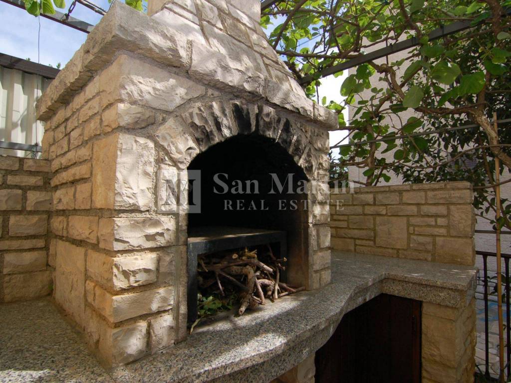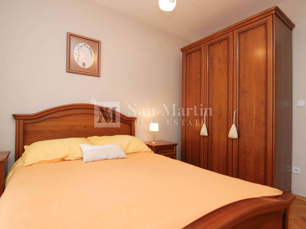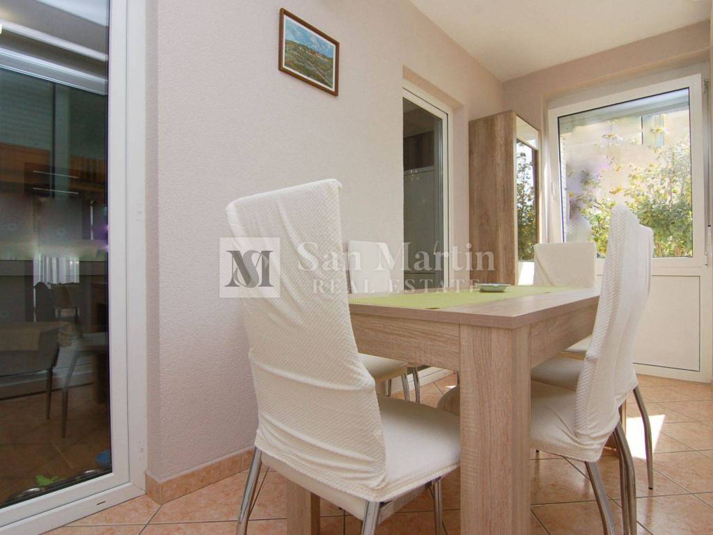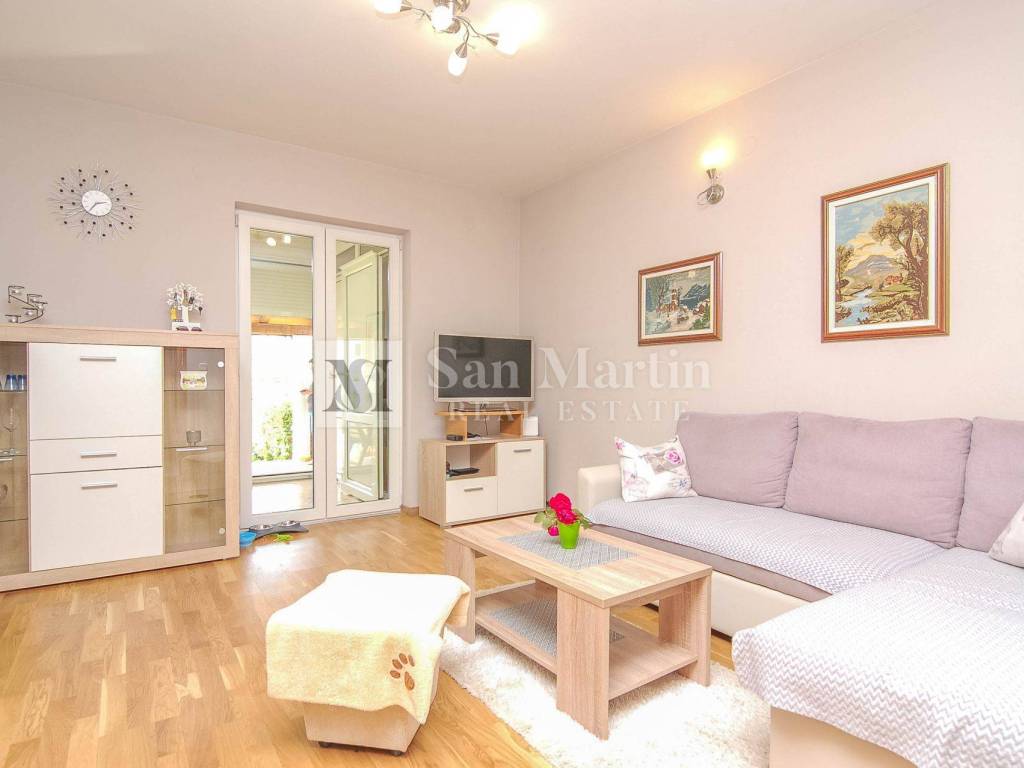 Stan se sastoji od dnevnog boravka sa kuhinjom, dvije spavaće sobe, ulaznog hodnika, kupatila, ostave, zatvorene lođe koja ima funkciju blagavaone, natkrivene terase od 15 m2. U vrtu se nalazi i kućica za alat , dio za roštiljanje sa kaminom i stolom, mini vočnjak sa mediteranskim kulturama i agrumima. Vrt ima svoja dva zasebna ulaza tako da je vrlo praktičan. Stanu pripada i jedno natkriveno parkirno mjesto iza zgrade.