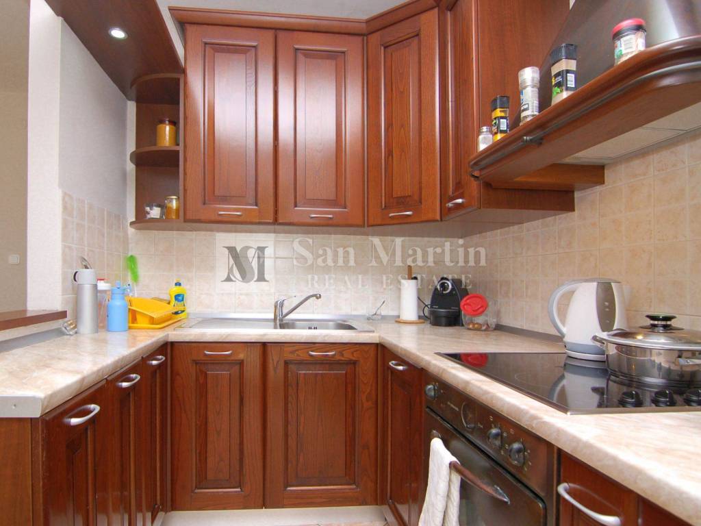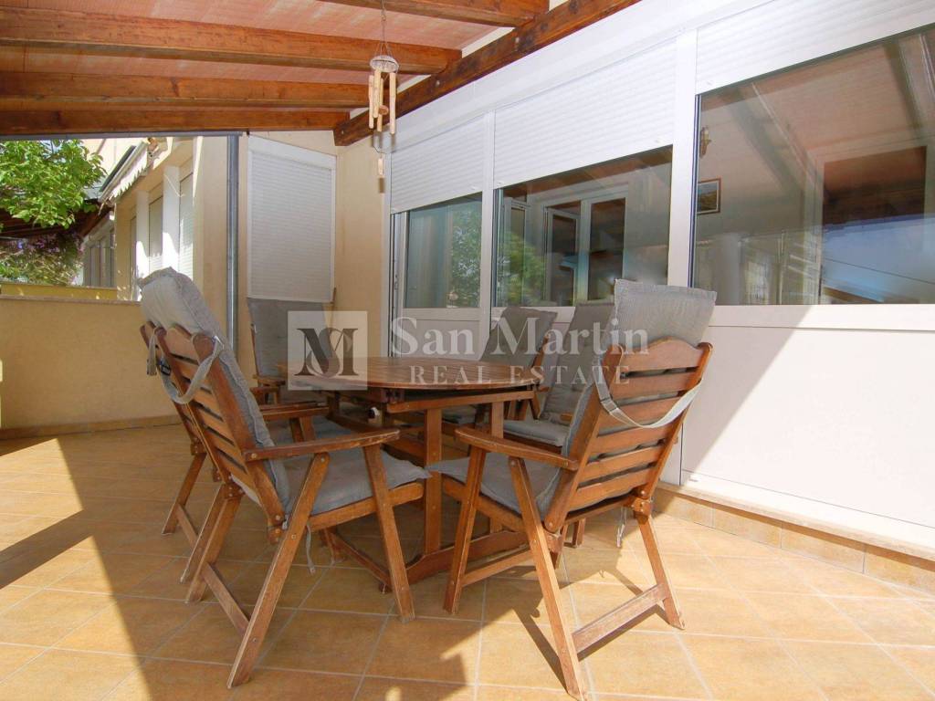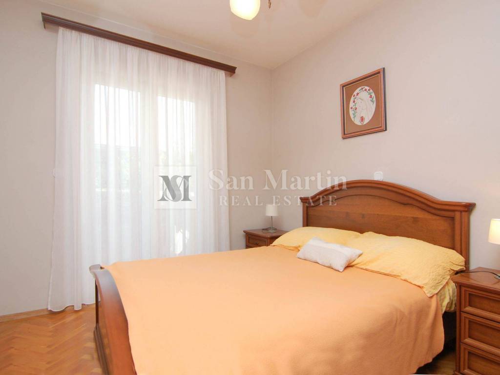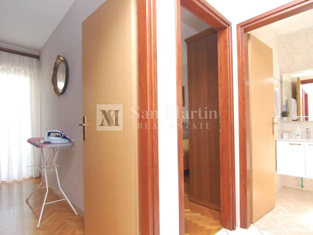 Stan se sastoji od dnevnog boravka sa kuhinjom, dvije spavaće sobe, ulaznog hodnika, kupatila, ostave, zatvorene lođe koja ima funkciju blagavaone, natkrivene terase od 15 m2. U vrtu se nalazi i kućica za alat , dio za roštiljanje sa kaminom i stolom, mini vočnjak sa mediteranskim kulturama i agrumima. Vrt ima svoja dva zasebna ulaza tako da je vrlo praktičan. Stanu pripada i jedno natkriveno parkirno mjesto iza zgrade.