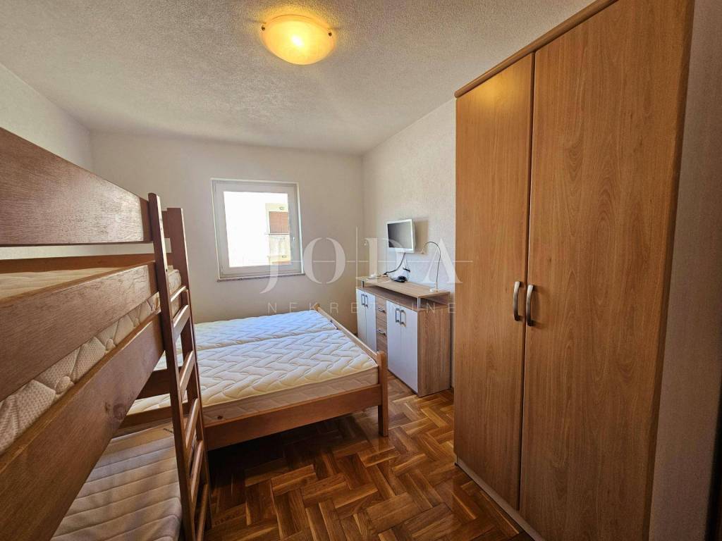Prodaje se apartman površine 68,69 m2 u prizemlju apartmanske zgrade. Apartman se sastoji od dvije spavaće sobe, dnevnog boravka s kuhinjom i blagovaonom, kupaone, hodnika i balkona s pogledom na more. Namješten, klimatiziran.