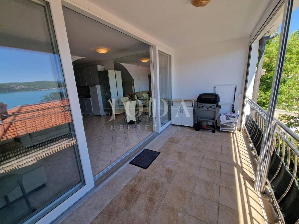 Apartman se proteže kroz dvije etaže, visoko prizemlje i potkrovlje a ima otvoren pogled na more s obje etaže. U visokom prizemlju se nalazi ulazni hodnik, dnevni boravak s kuhinjom i blagovaonom, spavaća soba, kupaonica i loggia s pogledom ma more na kojoj se nalazi i roštilj. Na gornjoj etaži nalazi se velika spavaća soba, fitness soba s jacuzzijem, električnim priključkom za moguću saunu kao i terasa s tušem i otvorenim pogledom na more. Na balkonskim vratima su stavljeni komarnici, a obje etaže su klimatizirane. Apartman je adaptiran 2022. godine, prodaje se potpuno namješten i spreman za korištenje. Na zajedničkom dijelu dvorišta je uređeno igralište za djecu i grill sa stolom i klupama. Osigurano je parkirno mjesto. Svi sadržaji se nalaze na pješačkoj udaljenosti od apartmana.