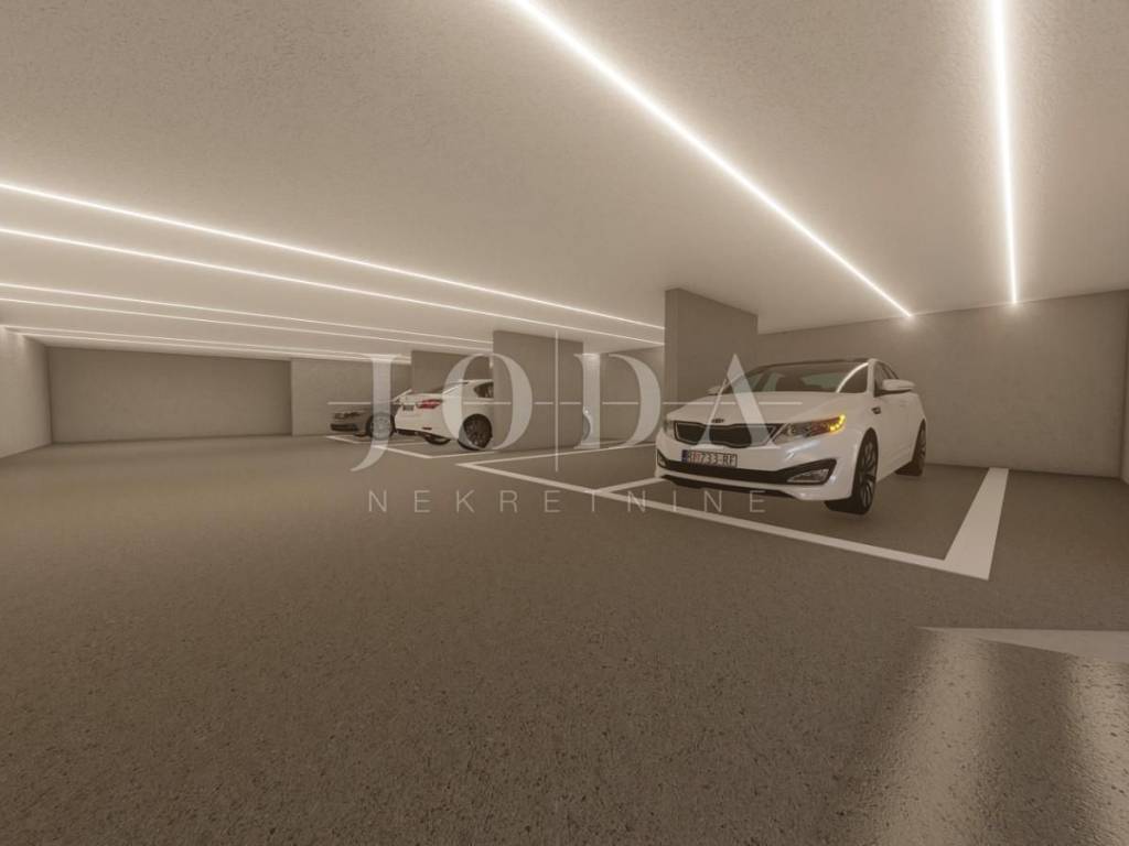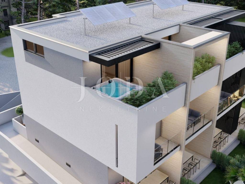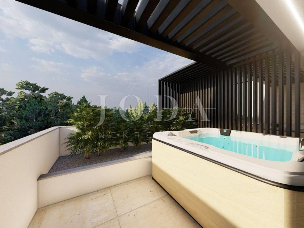 Apartman se nalazi u gradu Krku. Stambene je površine 100 m2 i proteže se kroz tri etaže. U prizemlju se nalazi ulazni prostor, dnevni boravak i kuhinja s blagovaonom, toalet, stubište i terasa s izlazom na vrt. Na prvoj etaži su dvije spavaće sobe, hodnik, kupaonica i balkon, a na drugom katu je galerija(soba) površine 22 m2 s kupaonicom i izlazom na prekrasnu terasu s jacuzzijem. Zgrada je trenutno u izgradnji. Pri izgradnji se koriste visoko kvalitetni materijali i oprema. Apartman će imati podno grijanje i fan coiler sustav grijanja i hlađenja. Apartmanu pripada i parkirno mjesto u garaži te na vanjskom parkingu. U garaži će biti priprema za punionicu električnih automobila. Odlična pozicija blizu mora i svih sadržaja!