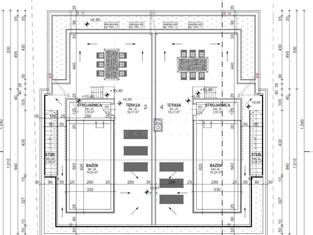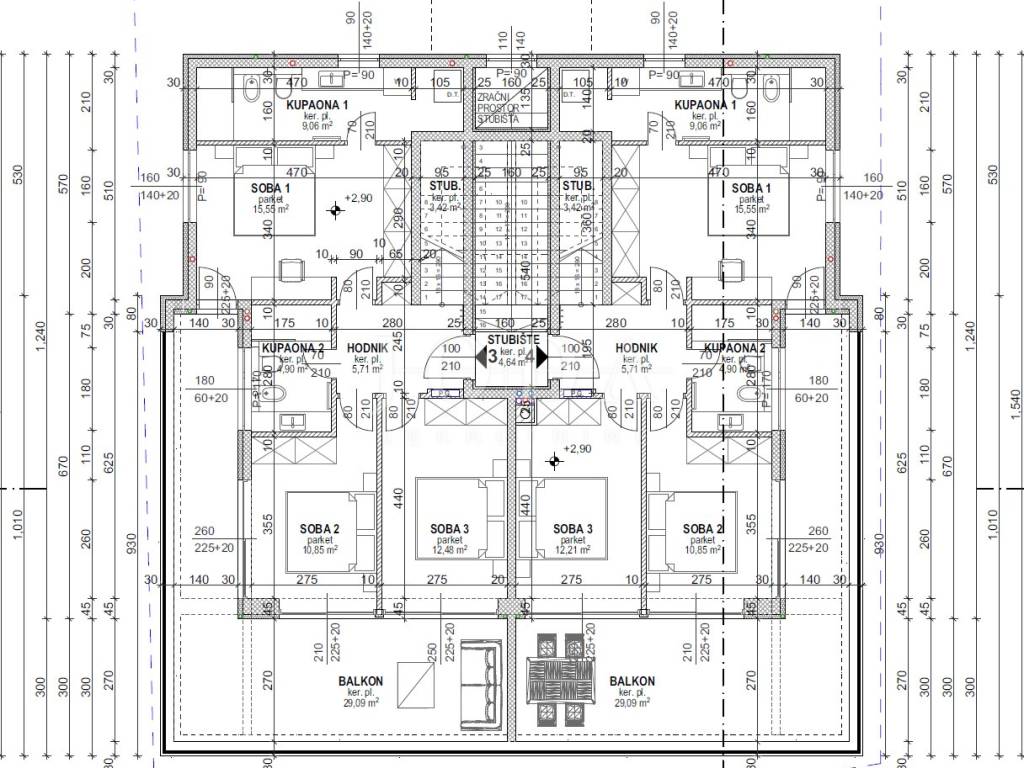 Apartman se prostire na dvije etaže i ima ukupnu zatvorenu površinu od 167 m. Uz to, stvarna iskoristiva površina, uključujući dva parkirna mjesta i krovnu terasu, iznosi približno 270 m.