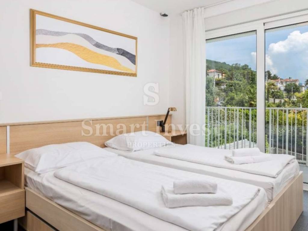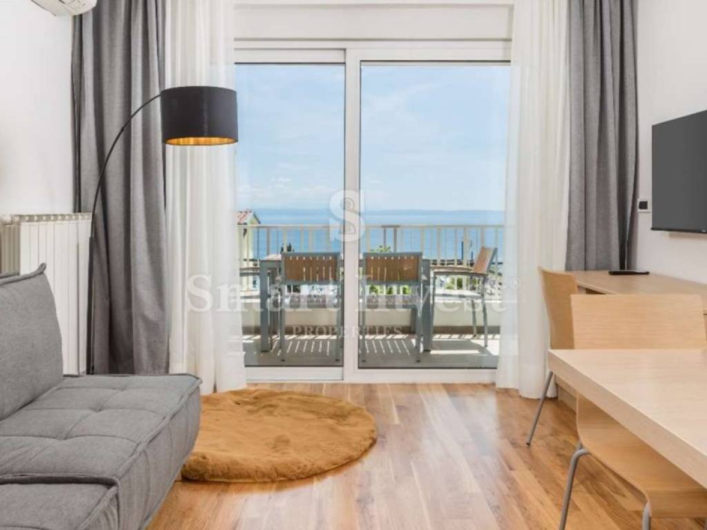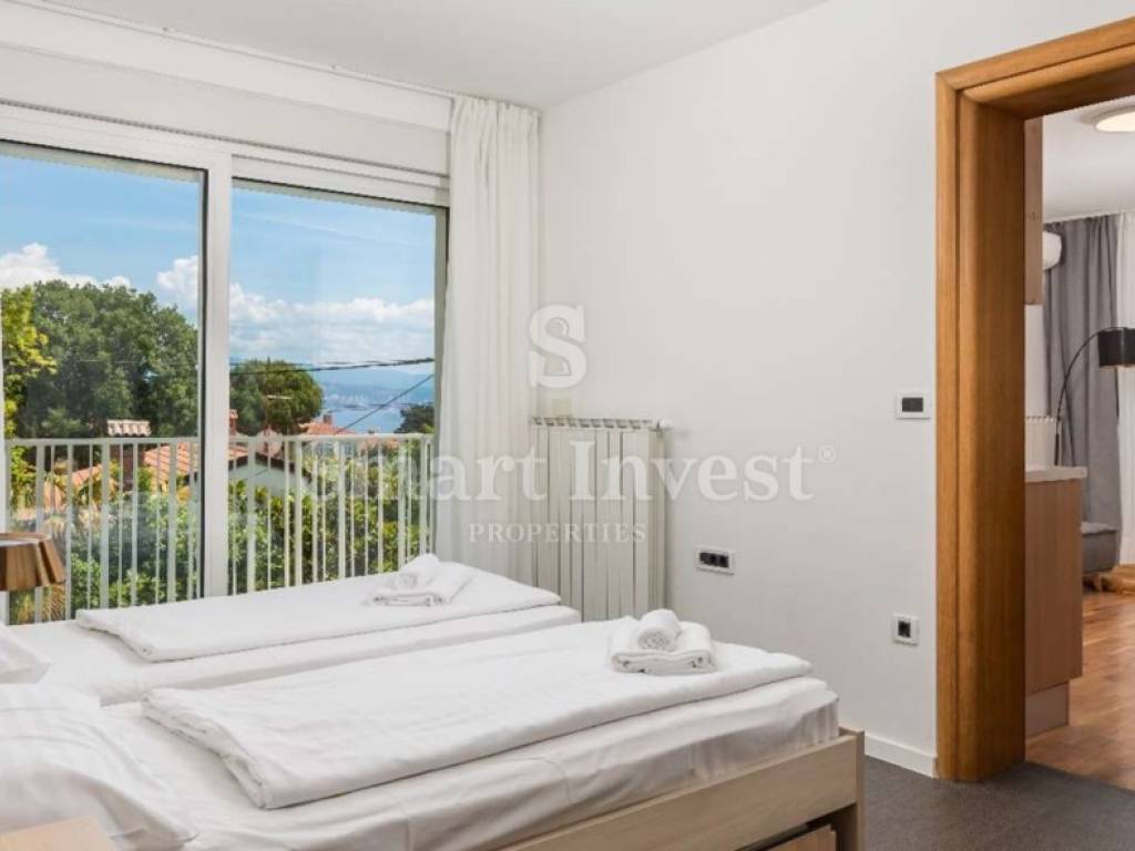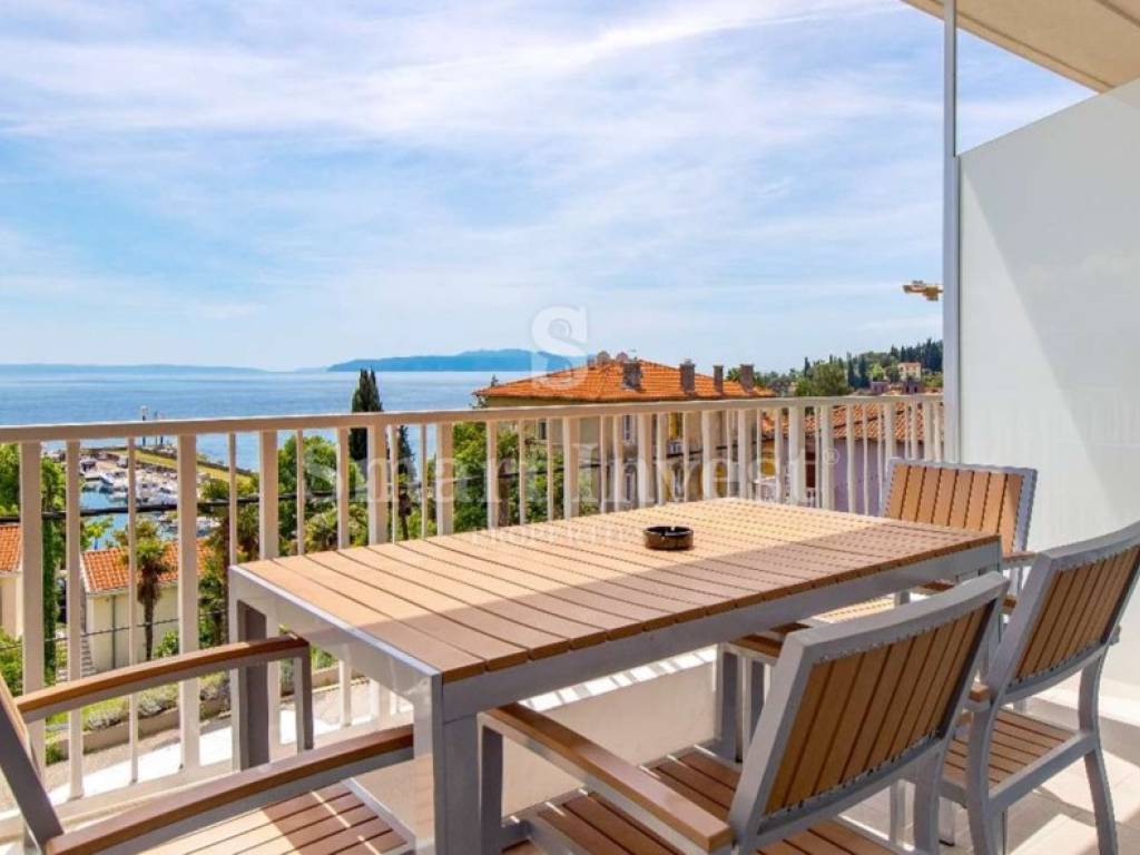 Stan se nalazi na 1. katu u zgradi i ima dvije lijepe terase iz kojih se pruža prekrasan pogled na cijeli Kvarner.