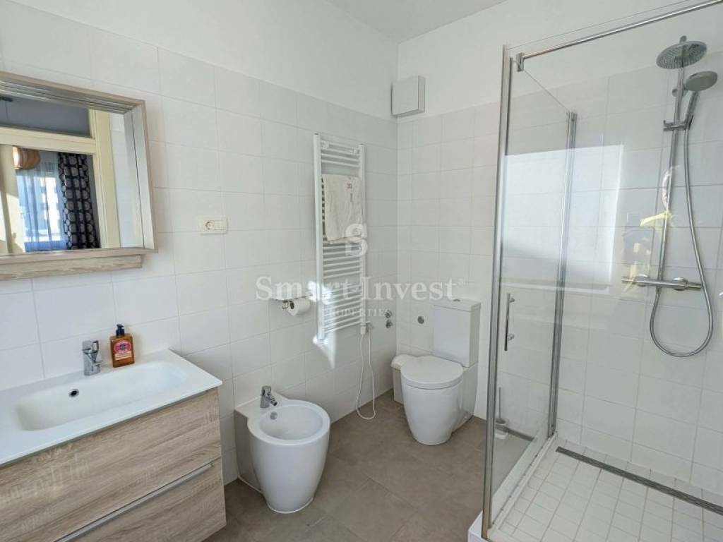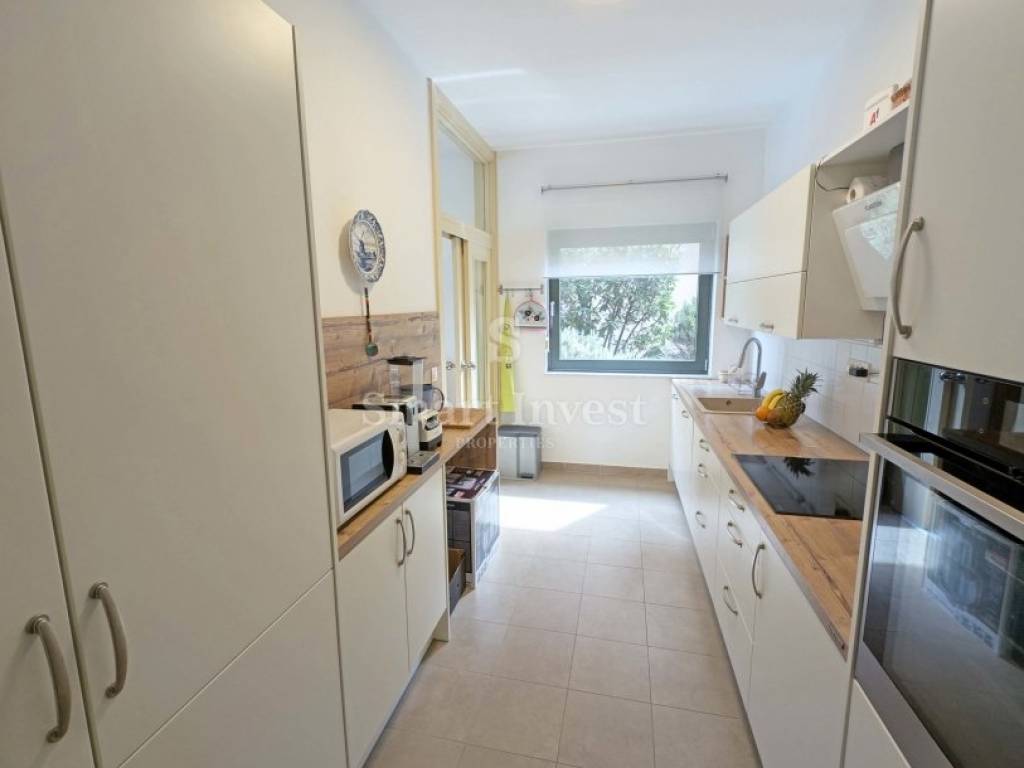 Na donjoj etaži nalazi se prostrani dnevni boravak povezan s potpuno opremljenom kuhinjom i blagovaonicom, gostinjski toalet te dvije spavaće sobe, svaka s vlastitom kupaonicom. Unutarnje stepenice vode na gornju etažu gdje se nalazi treća spavaća soba s kupaonicom, prostrana walk-in garderoba, vešeraj i spremište. Stan je u potpunosti uređen, a sav ugrađeni namještaj, uključujući kuhinju s aparatima, ostaje budućem vlasniku.