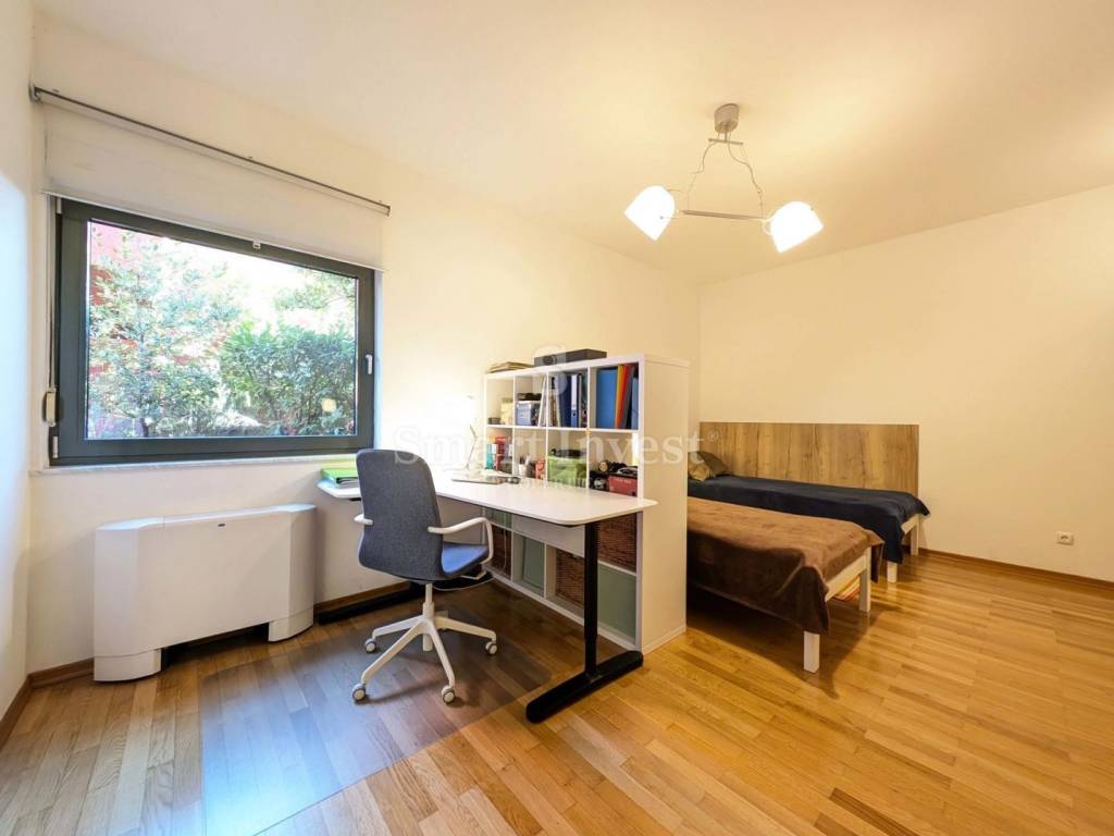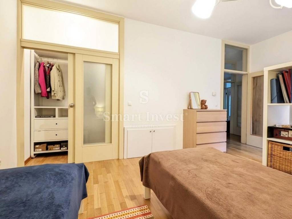 Stan ukupne površine 158,69 m smješten na 4. i 5. katu zgrade s liftom te nudi visoku razinu komfora, funkcionalan raspored i privatnost, a dodatnu vrijednost mu daje mogućnost podjele na dva odvojena stana, što je bila i njegova izvorna konfiguracija. Posebna prednost stana je zeleni vrt smješten uz ulaz na 4. katu, idealan za opuštanje u miru i zelenilu prava rijetkost u centru grada.