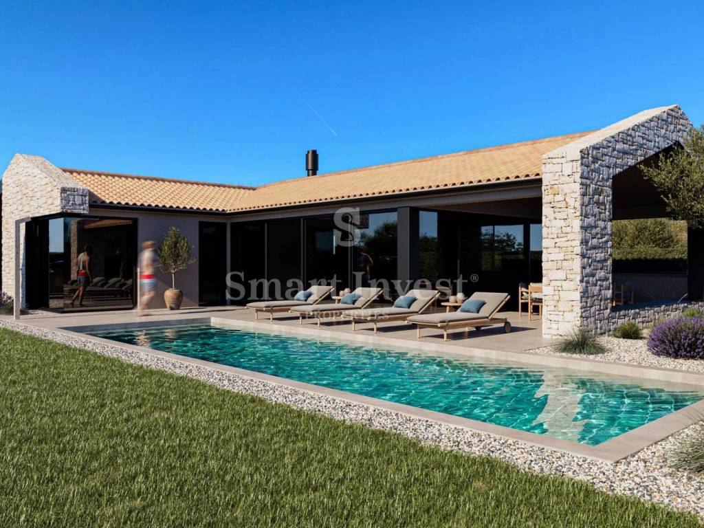 Ova luksuzna prizemnica, smještena u mirnoj okolici Poreča, uz samu granicu građevinske zone, prostire se na 130 m stambenog prostora, dok okućnica od 500 m nudi očaravajući pogled na netaknutu prirodu. Vila je dizajnirana kao prizemni objekt, s naglaskom na prostran "open space" prostor koji povezuje dnevni boravak, blagovaonicu i modernu kuhinju potpuno opremljenu vrhunskim aparatima. Velike staklene površine omogućuju obilje prirodnog svjetla i stvaraju osjećaj povezivanja s vanjskim prostorom. Iz ove centralne zone izlazi se na terasu s bazenom, savršeno mjesto za opuštanje i uživanje na svježem zraku.
