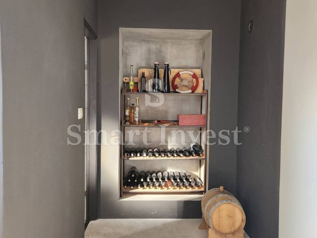 U suterenu se nalazi konoba i vinski podrum za druženja te dvije garaže (konoba ima vlastitu kupaonicu). U prizemlju se nalazi 3-sobni stan s dnevnim boravkom, kuhinjom s blagovaonicom, kupaonicom i toaletom. Iz stana se izlazi na veliku terasu s pogledom na more; u nastavku terase je vrt i prostorija za fitness ili drugi sadržaj, vešeraj i spremište za vrtne potrepštine. Ovaj stan ima grijanje na klima uređaje i norveške radijatore.