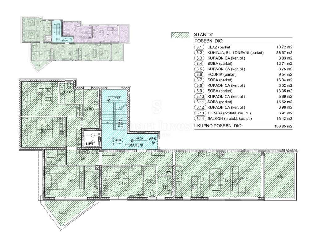 STAN 3, sveukupne korisne površine 198,45 m2, smješten na 3. katu te se sastoji od ulaznog hodnika, dnevnog boravka s kuhinjom i blagavaonicom, 3 spavaće sobe sa vlastitim kupaonicama, još jedne spavaće sobe i još dvije kupaonice, hodnika, natkrivenog balkona i lođe (ukupne korisne površine 156,85 m2) te 2 garažna parkirna mjesta