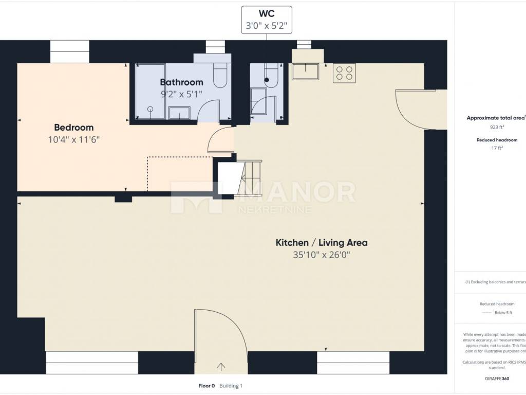 Prizemlje: open-space dnevni prostor s kuhinjom i kaminom, toilet, 1 soba