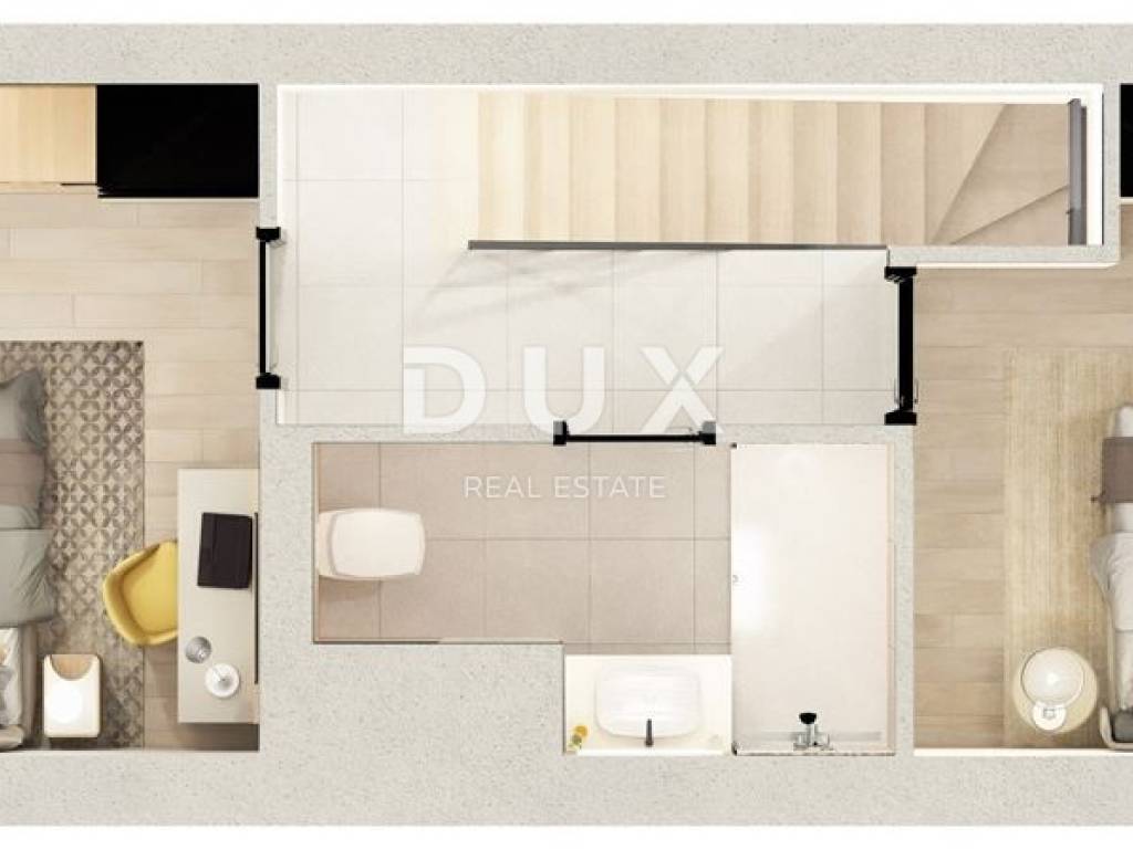 Elegantno unutarnje stubište vodi na drugu etažu, gdje se nalaze dvije prostrane spavaće sobe i kupaonica.