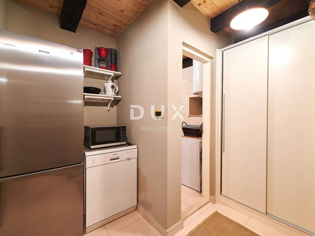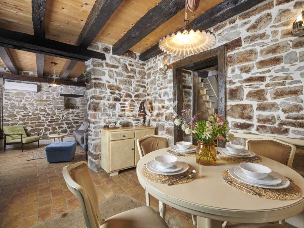 Zatim prostrani dnevni boravak s autentičnim ognjištem, ugodna blagovaonica, kuhinja u rustikalnom stilu te wc upotpunjuju prizemni prostor, dok elegantne drvene stepenice vode na kat.
