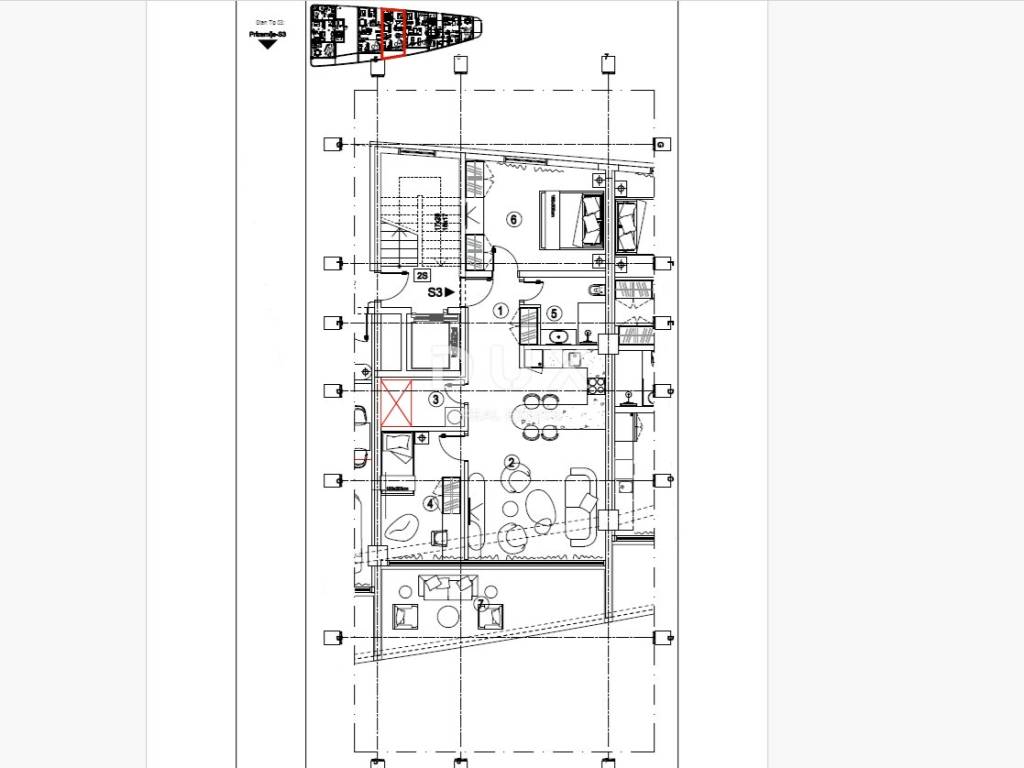 Stan S3 veličine 102m2 nalazi se u prizemlju, a sastoji se od dvije spavaće sobe, jedne komotne kupaonice, kuhinje, blagavaone i dnevnog boravka. Stan komunicira s prekrasnom natkrivenom terasom s kojeg se pruža zaista panoramski pogled na more.