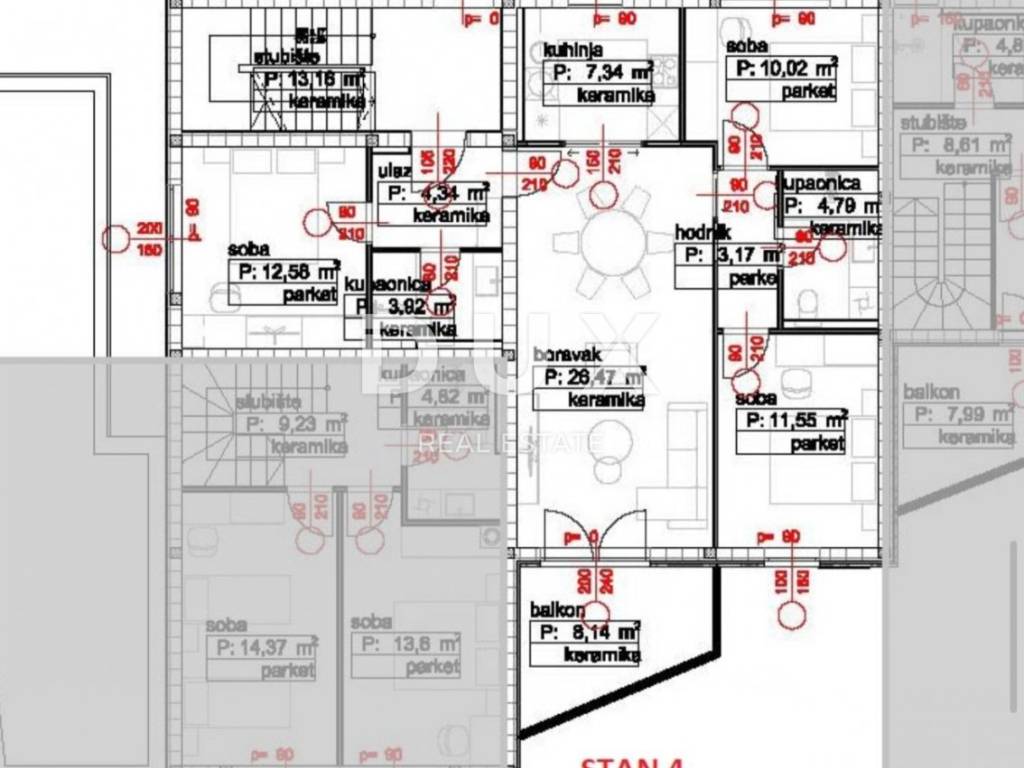 Stan S4 na 1. katu se sastoji od tri spavaće sobe, dnevnog boravka s kuhinjom i blagovaonicom, dva kupatila, hodnika i balkona. Stanu pripadaju dva parkirna mjesta.