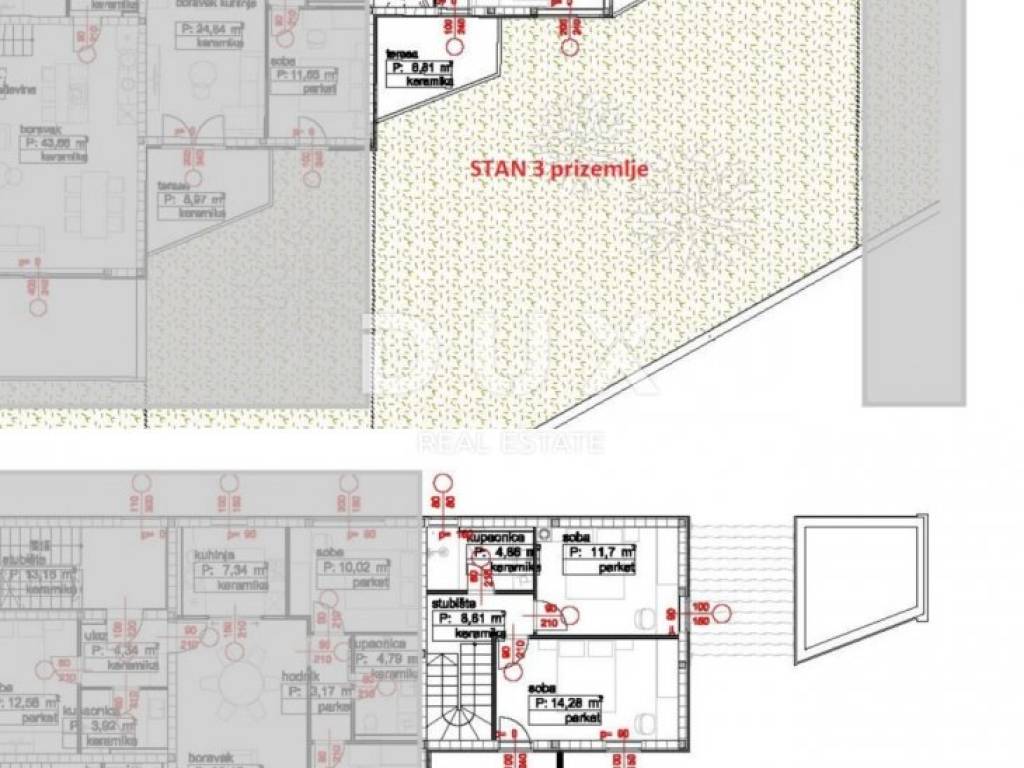 Dvoetažni stan S3 se sastoji od dvije spavaće sobe, dnevnog boravka s kuhinjom i blagovaonicom, dva kupatila, stubište, velika terasa, balkona i dvorište od 180 m2. Stanu pripadaju dva parkirna mjesta.