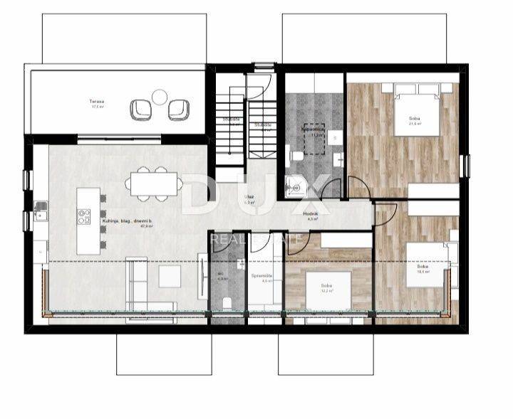 Iz dnevnog boravka se izlazi direktno na terasu. Njegova ukupna površina iznosi 148.93 m2.