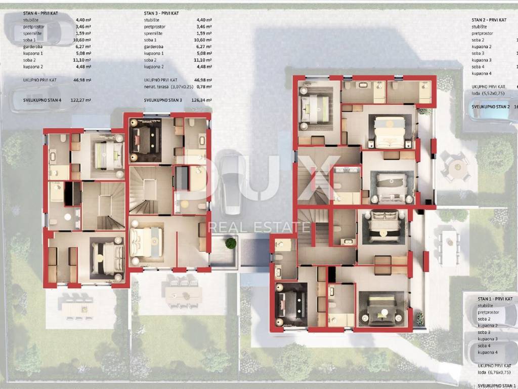 Na prvom katu se nalaze tri komforne spavaće sobe, svaka sa svojom kupaonicom. Dvije soba imaju i zajedničku terasu. Ukupna površina prvog kata: 63.07 m