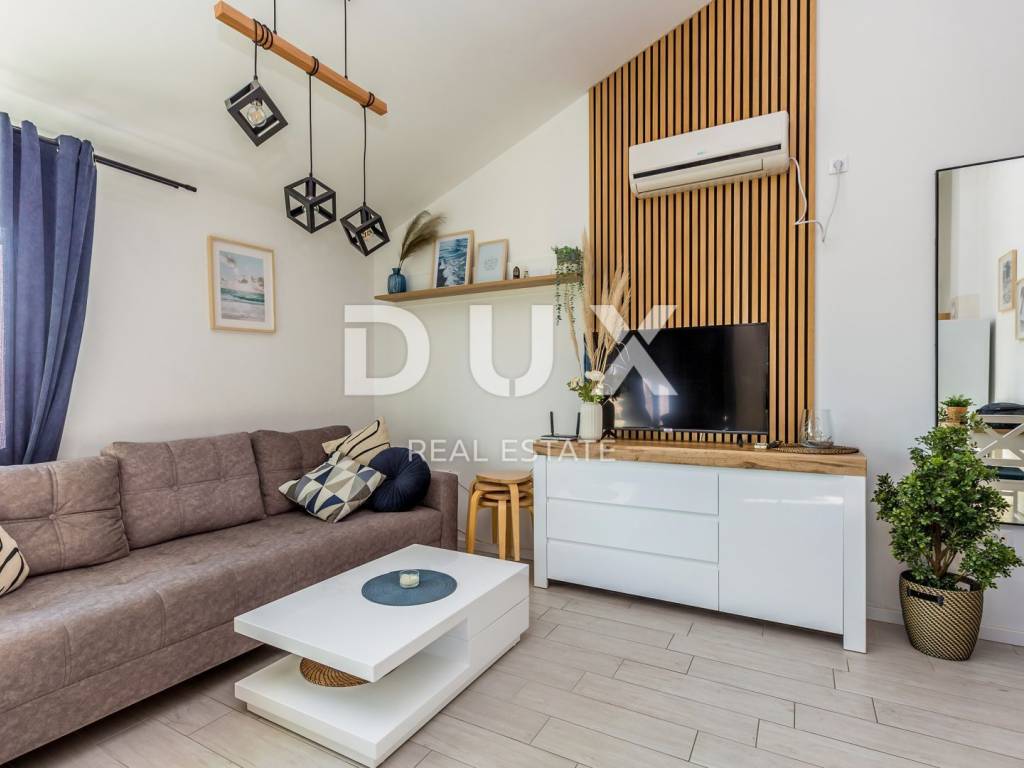 Stan se sastoji od dvije prostrane spavaće sobe, elegantno uređene kupaonice, zasebne moderne kuhinje s vrhunskim aparatima te prostrane blagovaonice s dnevnim boravkom, gdje svaki detalj odiše pažljivo odabranim luksuznim elementima. Najveći dragulj ovog apartmana je impresivna terasa s očaravajućim panoramskim pogledom na more, idealna za uživanje u jutarnjoj kavi ili večernjem opuštanju uz zvuk valova. Nekretnina se prodaje potpuno namještena i opremljena svaki komad namještaja, svaka tkanina i svaki dekorativni element biran je s posebnom pažnjom kako bi pružio jedinstven doživljaj boravka. Vlastito parkirno mjesto dodatna je pogodnost koja čini ovu nekretninu još ekskluzivnijom.