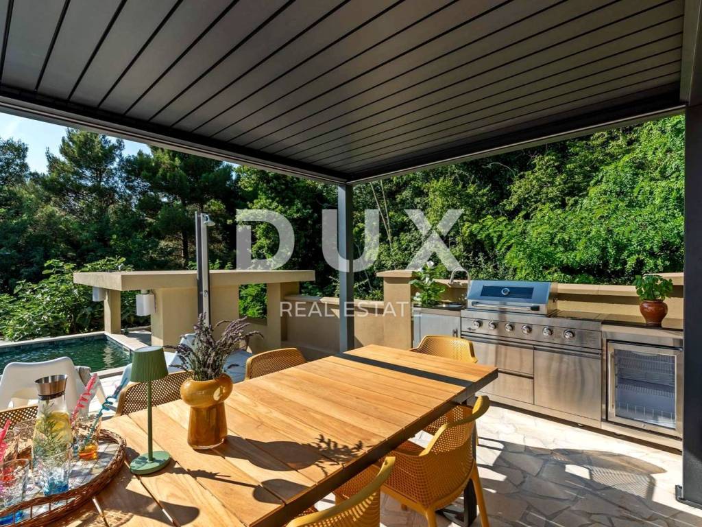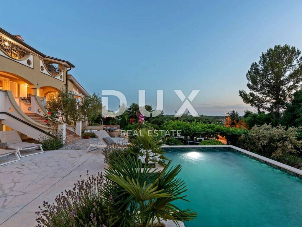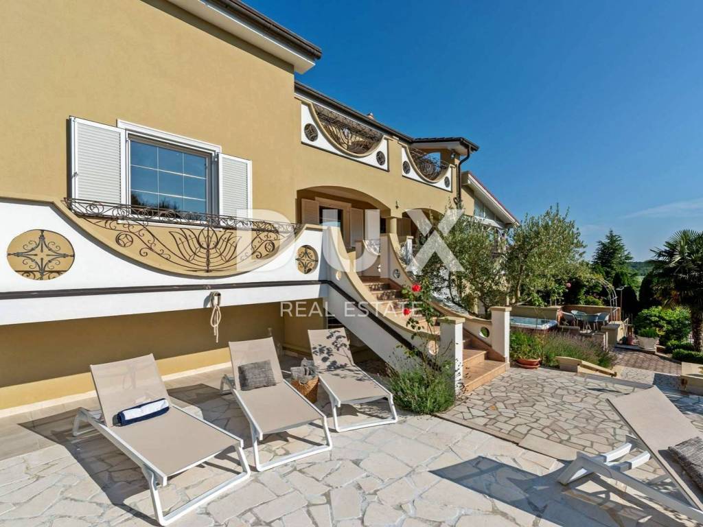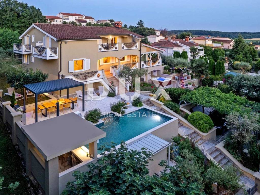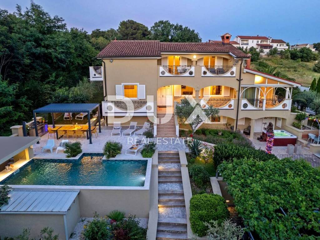 Prostrana okućnica koja obiluje zelenilom i cvijećem i raslinjem je ograđena i uređena do najsitnijeg detalja a savršen sklad zaokružuje bazen sa sunčalištem i elegantno ukomponiranom lounge zonom i natkrivena ljetna kuhinja.