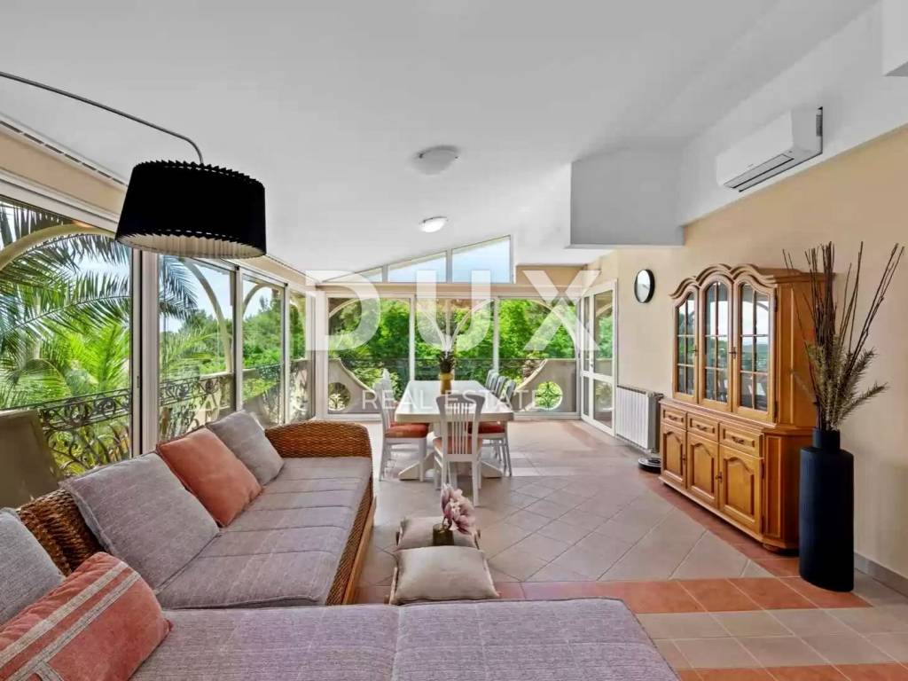 Kroz prizemlje i visoko potkrovlje se proteže dvoetažna stambena jedinica koja se sastoji od kuhinje, blagovaonice i dnevnog boravka s izlazom na prostranu zatvorenu terasu, pet spavaćih soba, dvije kupaonice, gostinjskog toaleta i ostave.