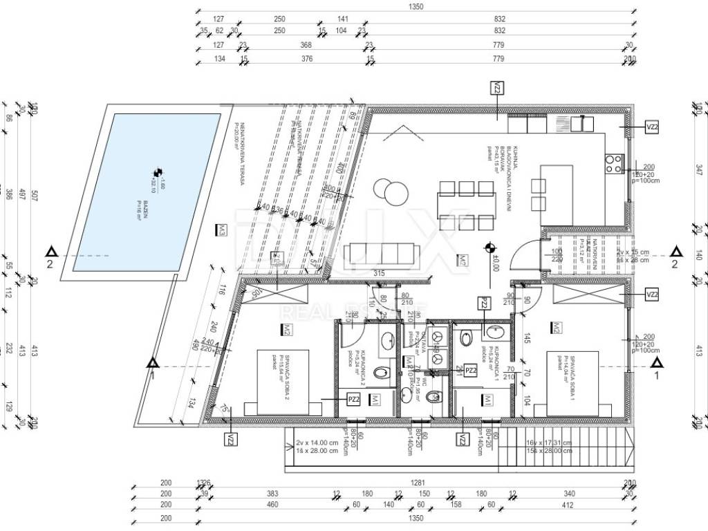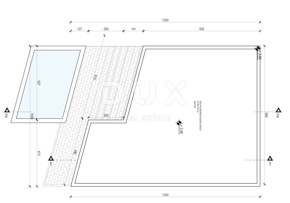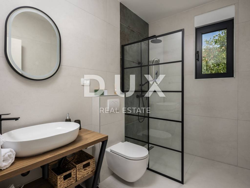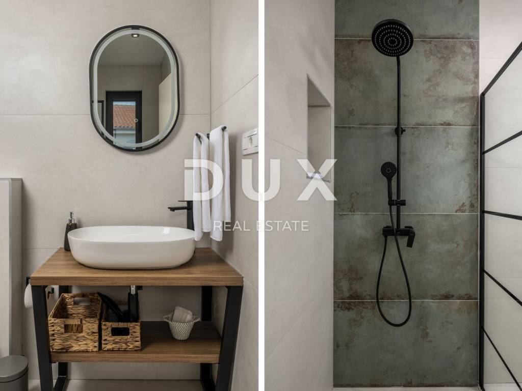 Na gornjoj etaži smješten je prostrani dnevni boravak s blagovaonicom i moderno opremljenom kuhinjom otvorenog koncepta, koja obiluje prirodnim svjetlom zahvaljujući velikim staklenim stijenama. Tu su i dvije udobne spavaće sobe glavna soba s vlastitom kupaonicom te još jedna soba uz zajedničku kupaonicu. Dodatnu praktičnost pružaju gostinjski WC, praonica i predsoblje. Ispred kuće nalazi se terasa s bazenom, sunčalištem i dijelom natkrivenim prostorom idealnim za uživanje u toplim ljetnim večerima.
