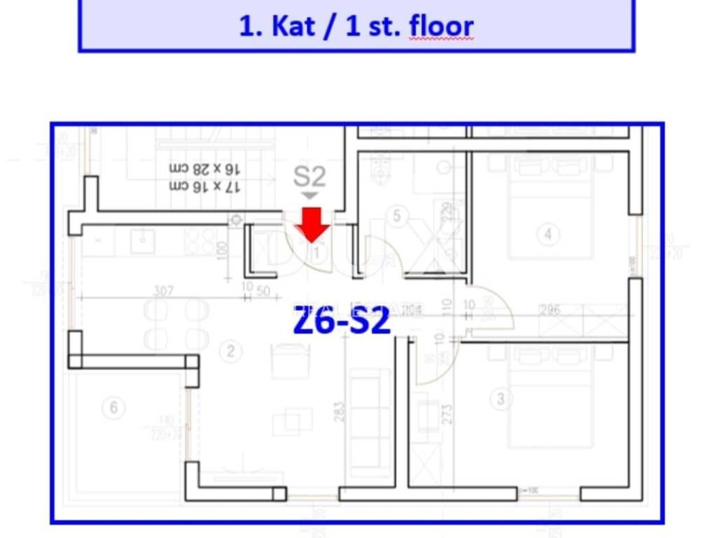 U ponudi je stan na prvom katu zgrade. Sastoji se od pretprostora, kuhinje sa blagovaonicom i dnevnim boravkom , dvije spavaće sobe, kupaonicom i balkonom.
