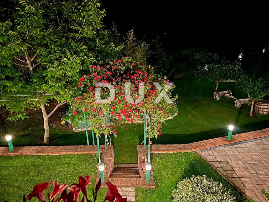 Okućnica je potpuno ograđena i hortikulturno uređena te sadrži preljevni grijani bazen sa popločenim sunčalištem i dječje igralište.