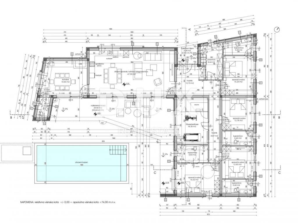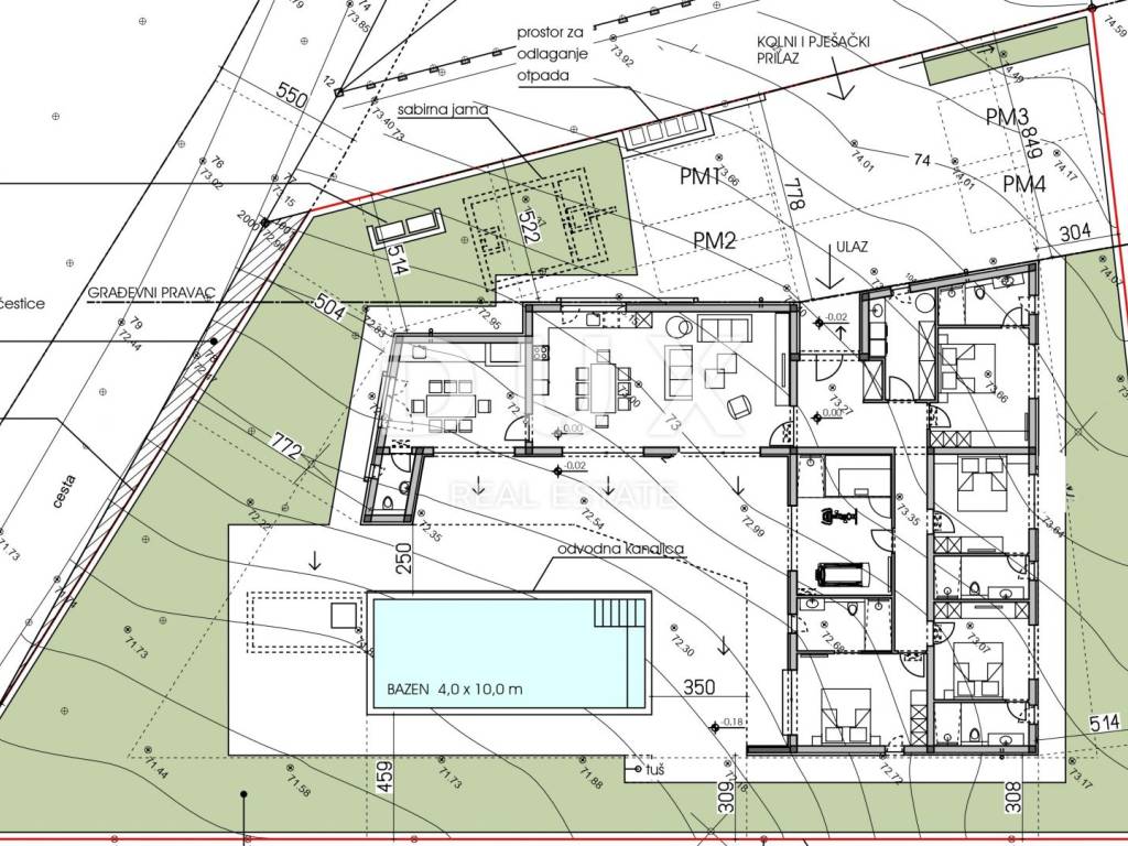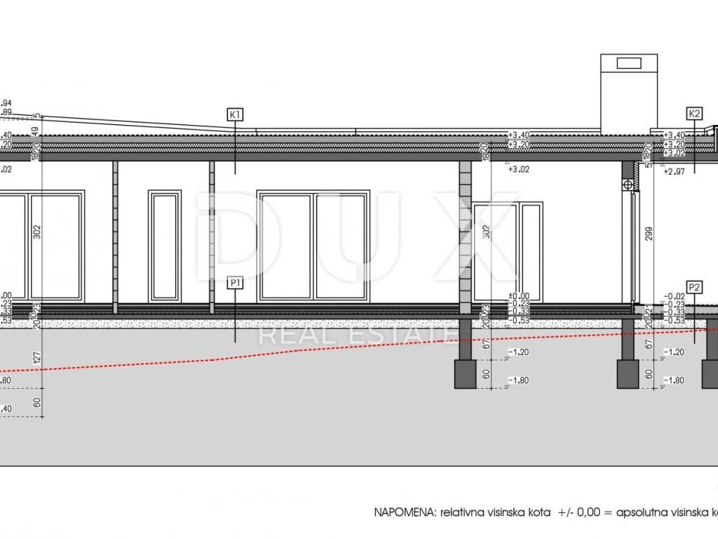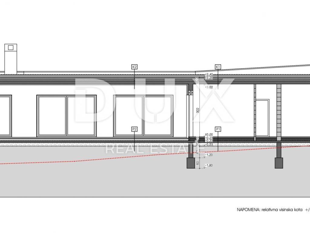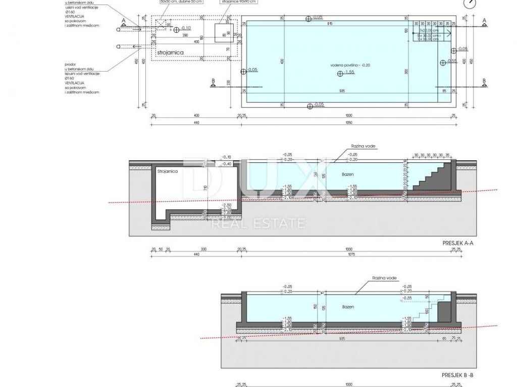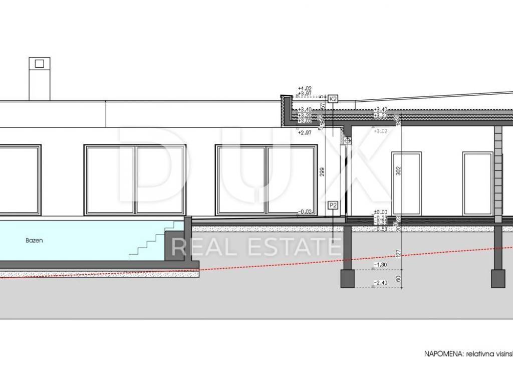 Riječ je o prizemnoj vili smještenoj nadomak grada Pule na mirnoj lokaciji koja se sastoji od svega nekoliko obiteljskih kuća i kuća za odmor. Budući vlasnici imaju priliku kupiti građevinsko zemljište od 1010m2 na kojemu je izdana građevinska dozvola za izgradnju prizemne vile od 220m2 NETO stambene površine uz bazen od 40m2 (4mX10m).