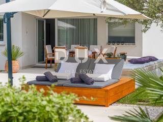 Iz dnevnog boravka se vrši komunikacija sa vanjskom natkrivenom terasom sunčalištem i bazenom površine 50m2, te vanjski tuš.