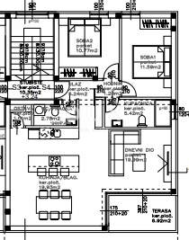 Sadržaj: 2 spavaće sobe, dnevni boravak s kuhinjom i blagovaonicom, dvije kupaonice, lođa garaža, spremište