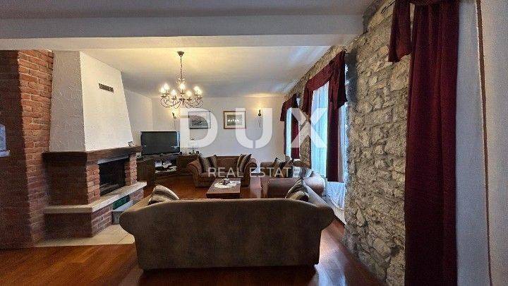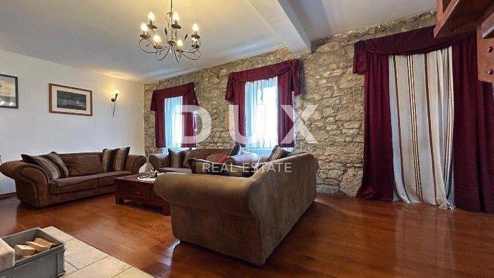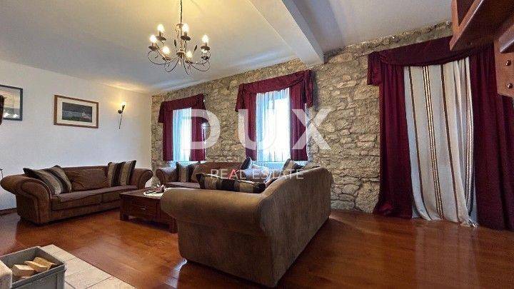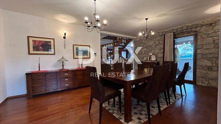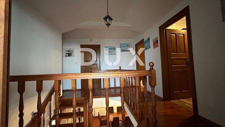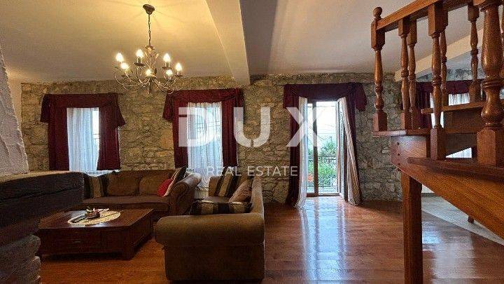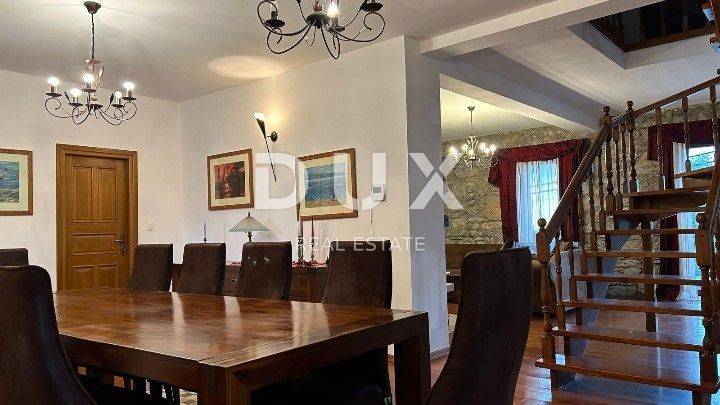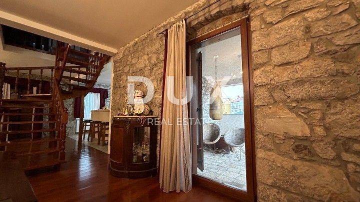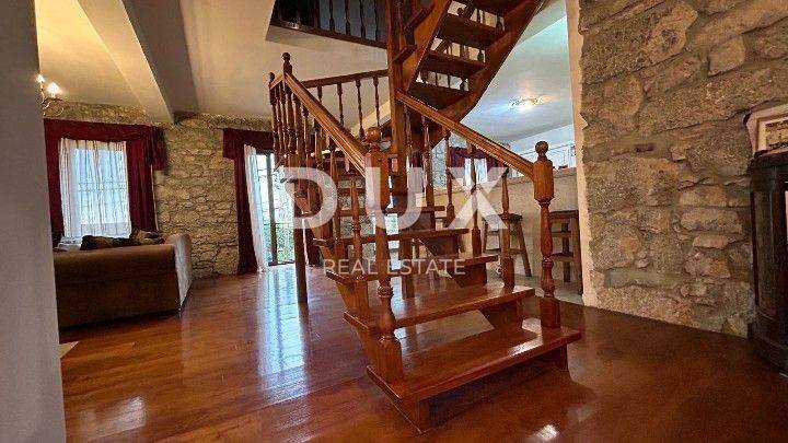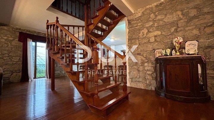 U prizemlju su smještena dva stana. Prvi je jednosobni sa dnevnim boravkom , kuhinjom i kupaonicom. Ima 45 m2 i izlaz na terasu od 15ak m2 dok je drugi veći, 107 m2 a raspolaže sa dvije spavaće sobe , dnevnoim boravkom, kuhinjom i kupaonicom. Također ima izlaz na terasu i okućnicu. Na prvom katu i u visokom potkrovlju, smješten je veliki obiteljski, dvoetažni stan, od 250 m2, potpuno opremljen. Kuća je smještena na velikoj okućnici na kojoj se nalazi ljetna kućica/konoba sa kupatilom, toaletom i velikom prostorijom za druženje sa kaminom. Za potrebe parkiranja na raspolaganju su 6 parkirnih mjesta.