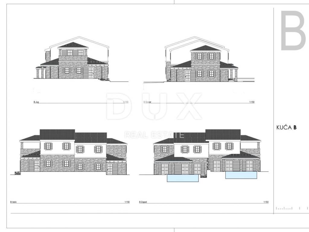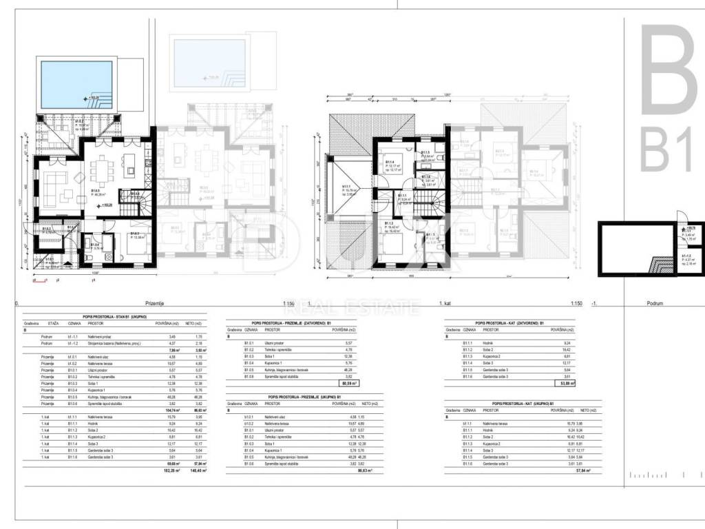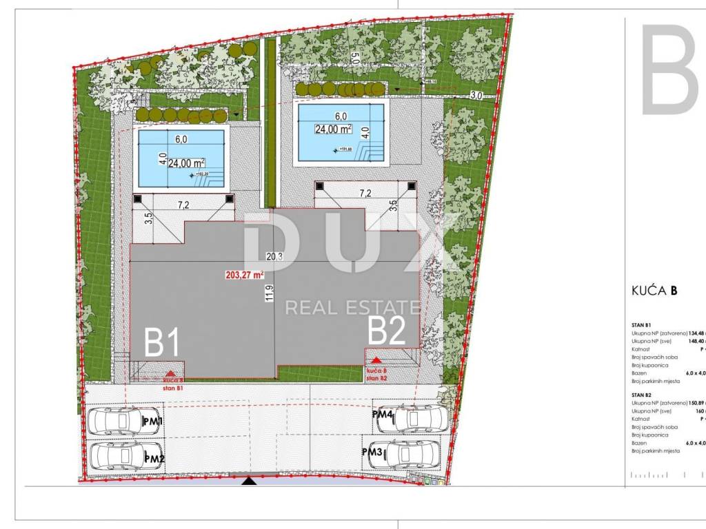 Prodaje se projekt dvojne kuće B svaka sa svojim vlastitim bazenom, okućnicom i parkiralištem za dva automobila po svakoj, koja je razvedena na prizemlje i kat.