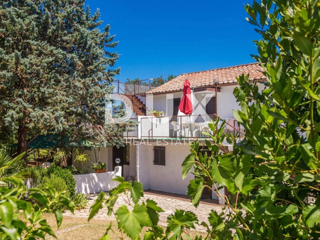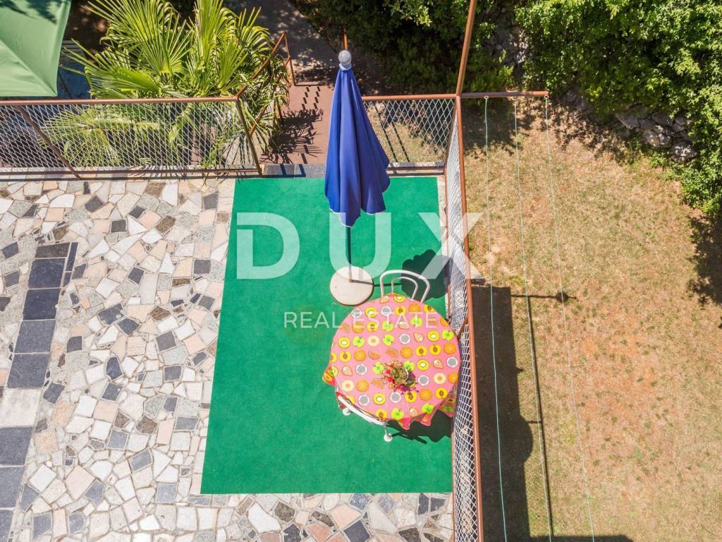 Kuća je na dvije etaže, ima vanjsko stepenište i prostranu terasu na 1. katu. U prizemlju je velika kamenom popločena terasa, prekrasan vrt u kojem je i zidani roštilj.