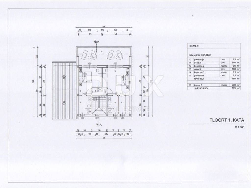 Unutarnjim stepeništem dolazi se na kat kuće, gdje se nalaze 2 spavaće sobe svaka sa svojom kupaonom, garderoba i zajednička terasa površine 25m2.