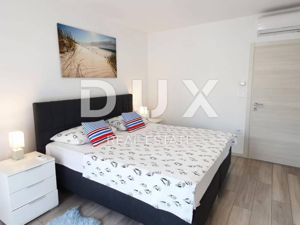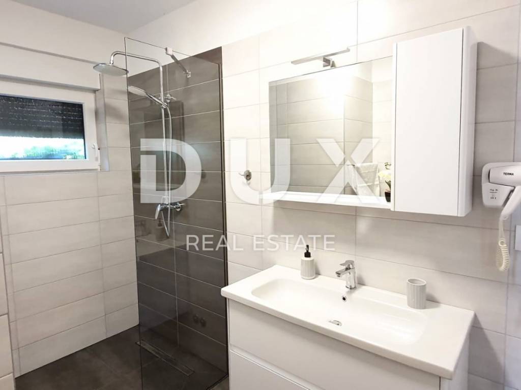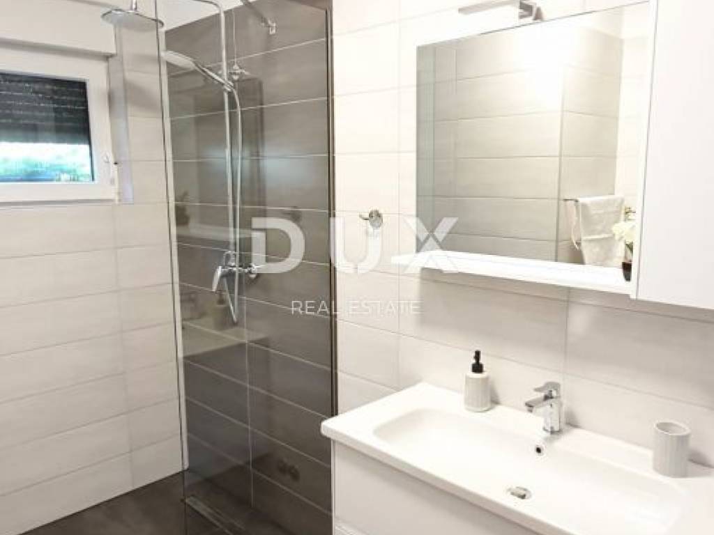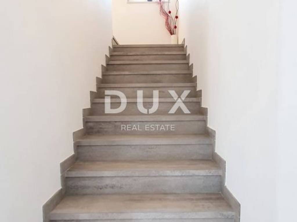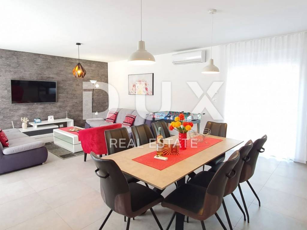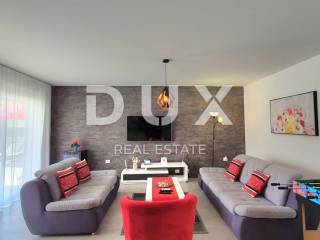 Ovo moderno opremljena vila sastoji se od prizemlja i kata. U prizemlju se nalazi kuhinja s blagovaonicom, dnevni boravak, ostava, kupaonica te jedna spavaća soba s vlastitom kupaonicom. Zahvaljujući svjetlosti koja dolazi sa svih strana, kao i detaljima koji su bili pažljivo promišljeni vila ima toplu i gostoljubivu atmosferu. Na prvom katu nalaze se još dvije spavaće sobe svaka s vlastitom kupaonicom i terasom. Iz dnevnog boravka kroz staklenu stijenu izlazi se na polunatkrivenu terasu, dok se na ograđenoj i uređenoj okućnici smjestio bazen od 29m2 sa slanom vodom, kamin, dječje igralište i parking.