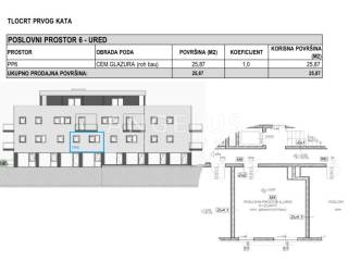 Prodaje se poslovni prostor u novogradnji ukupne neto površine 25.87 m2, uredska namjena, položen u prizemlju stambene zgrade, južne orijentacije. Poslovni prostor predaje se u roh bau stanju što uključuje dovršenu vanjsku ovojnicu, zaglađen betonski pod i dovedenom instalacijom vode, kanalizacije, električne energije i priključcima instalacije slabe struje. Zgrada moderne arhitekture i visoke energetske učinkovitosti gradi se prema suvremenim standardima od vrlo kvalitetnih materijala. Zgrada ima zatvorenu garažu sa parkirnim mjestima, prizemlje i tri kata. Cijena za parkirno mjesto u garaži iznosi 20.000 eur, dok vanjsko parkirno mjesto iznosi 12.000 eur. Kupac ima OBVEZU kupnje jednog parkirnog mjesta u garaži.